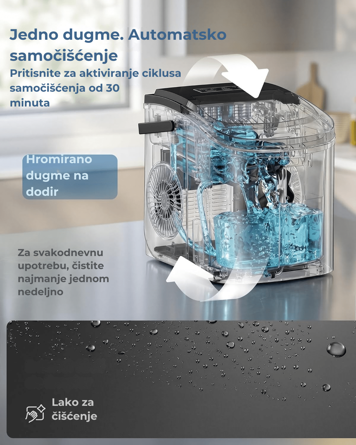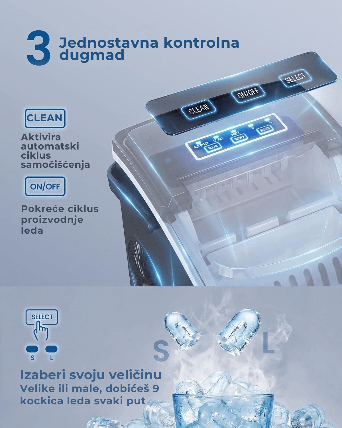 Jednostavno i intuitivno korišćenje – uređaj ima samo 3 dugmeta za maksimalnu praktičnost. Dugmetom ON/OFF pokrećete kontinuiranu proizvodnju leda, birate veličinu kockica ili aktivirate funkciju samočišćenja.