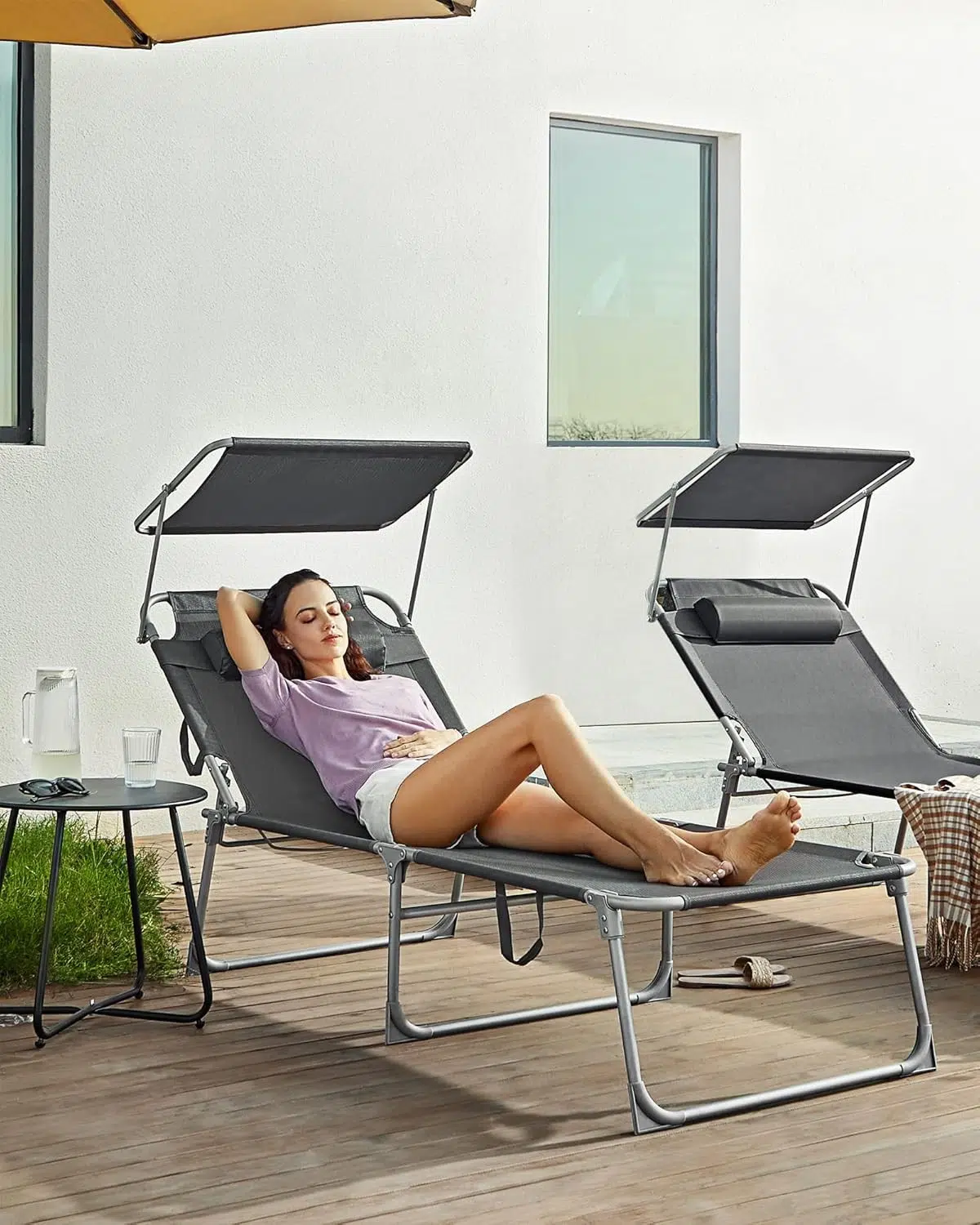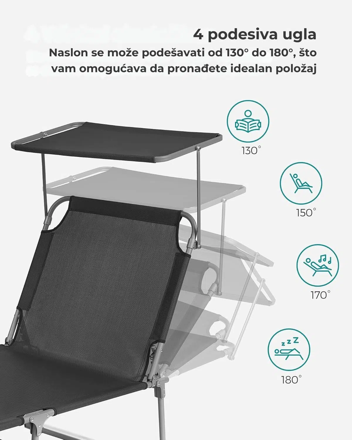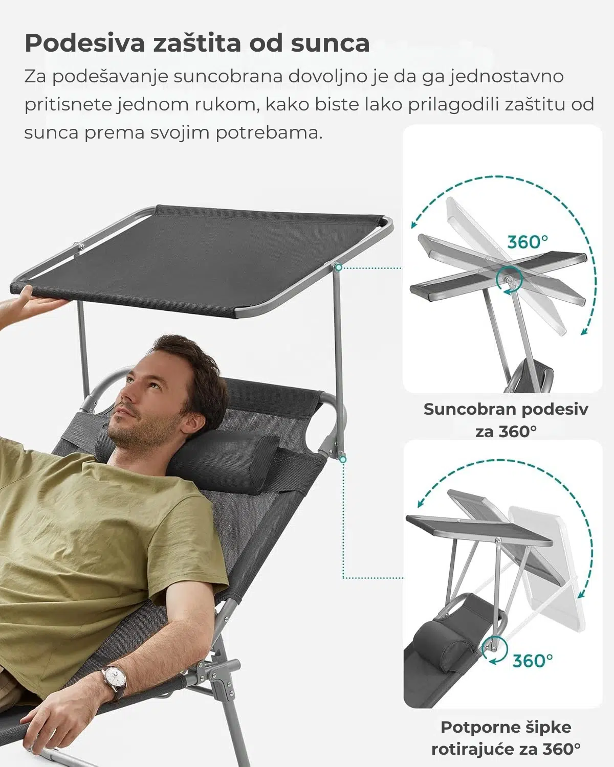 Uživajte u toplim sunčevim zracima bez neprijatnog zaslepljivanja. Zahvaljujući podesivom suncobranu, možete čitati knjigu ili časopis bez da vam sunce smeta. Kako se sunce pomera, jednostavno pomerite suncobran i prilagodite ga svojim potrebama.