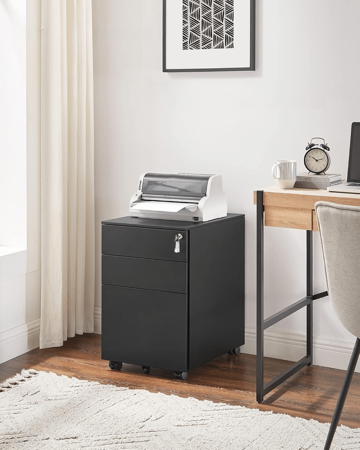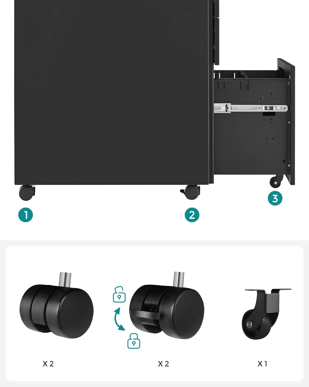 Za dodatnu sigurnost, sve tri fioke mogu se zaključati, čime su vaša dokumenta i lične stvari zaštićeni od neovlašćenog pristupa. Mobilnost je obezbeđena zahvaljujući točkićima koji se okreću za 360°, omogućavajući lako pomeranje i prilagođavanje prostoru prema potrebi.