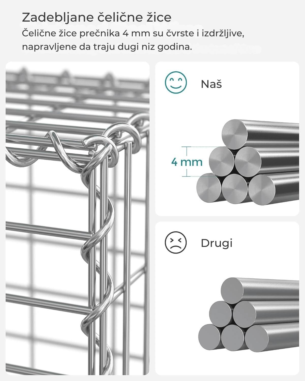 Gabion je izrađen od debelih čeličnih žica prečnika 4 mm, što obezbeđuje: