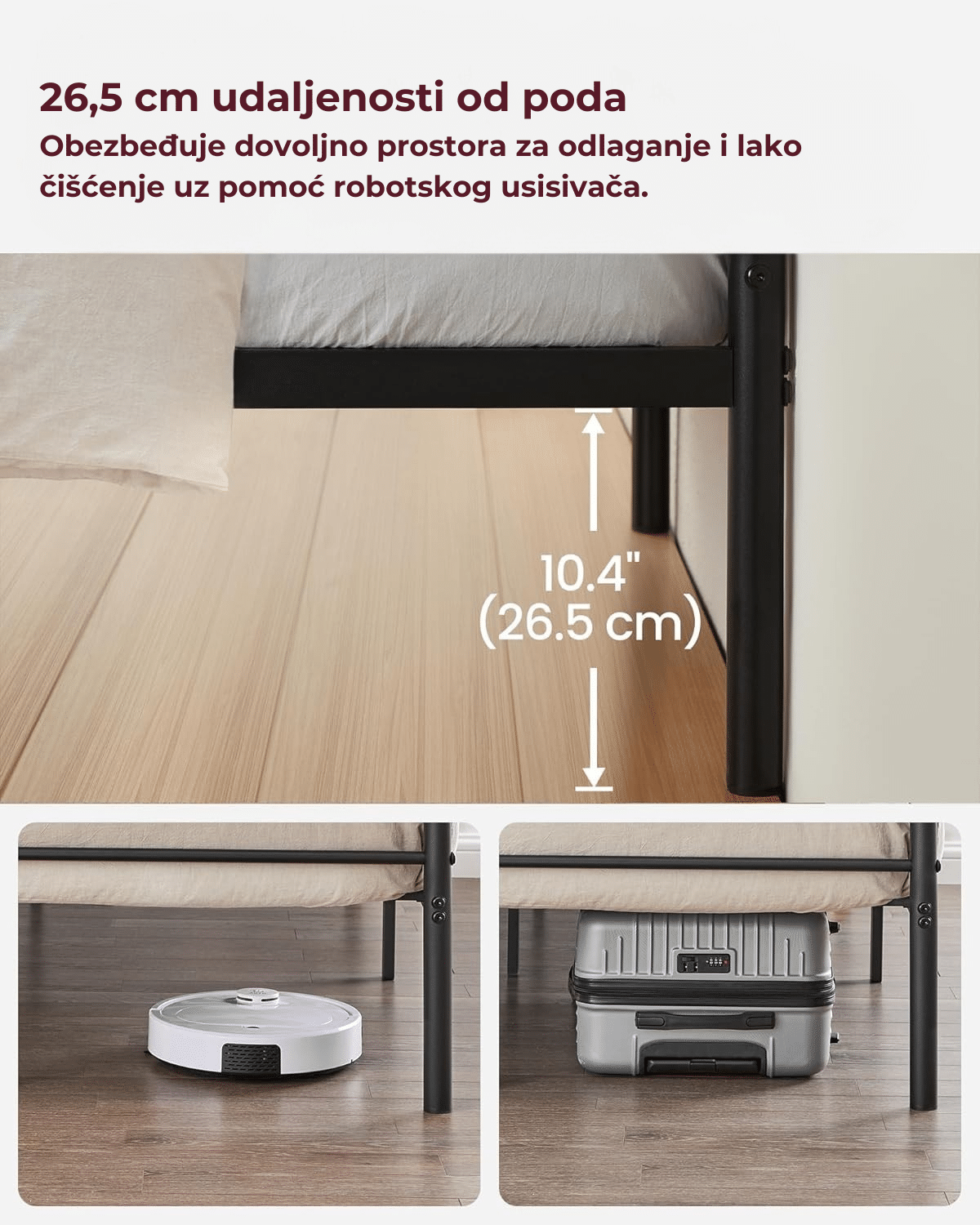 Potporne letvice nalaze se 26 cm iznad poda, što omogućava praktičan prostor za kutije za odlaganje. Takođe, robotski usisivač može lako proći ispod kreveta, što olakšava održavanje čistoće.