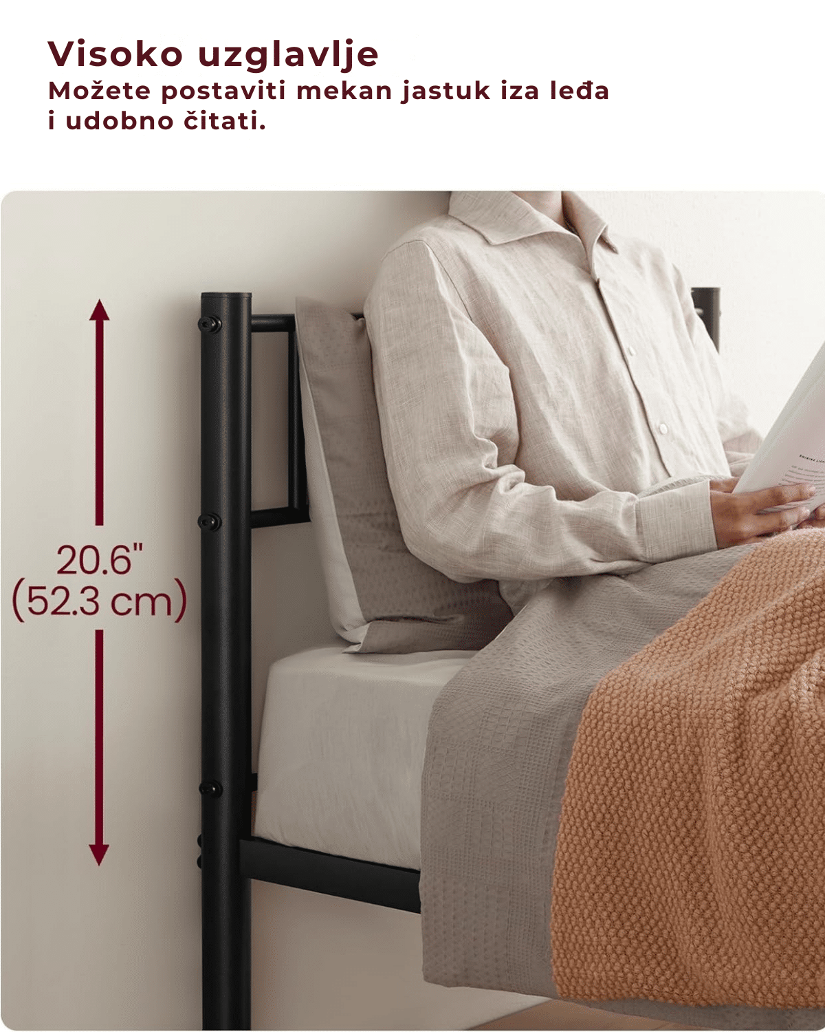 Minimalistički dizajn i klasična crna boja čine ovaj krevet savršenim dodatkom različitim stilovima enterijera. Visoko uzglavlje omogućava da postavite jastuk iza leđa i udobno se naslonite dok čitate ili se opuštate.