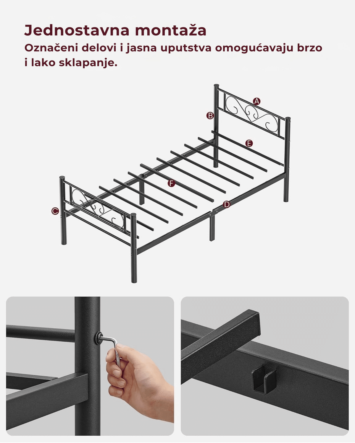 Zahvaljujući jasnim uputstvima i označenim delovima, ovaj metalni okvir za jednokrevetni krevet može se brzo i lako sastaviti bez komplikacija.