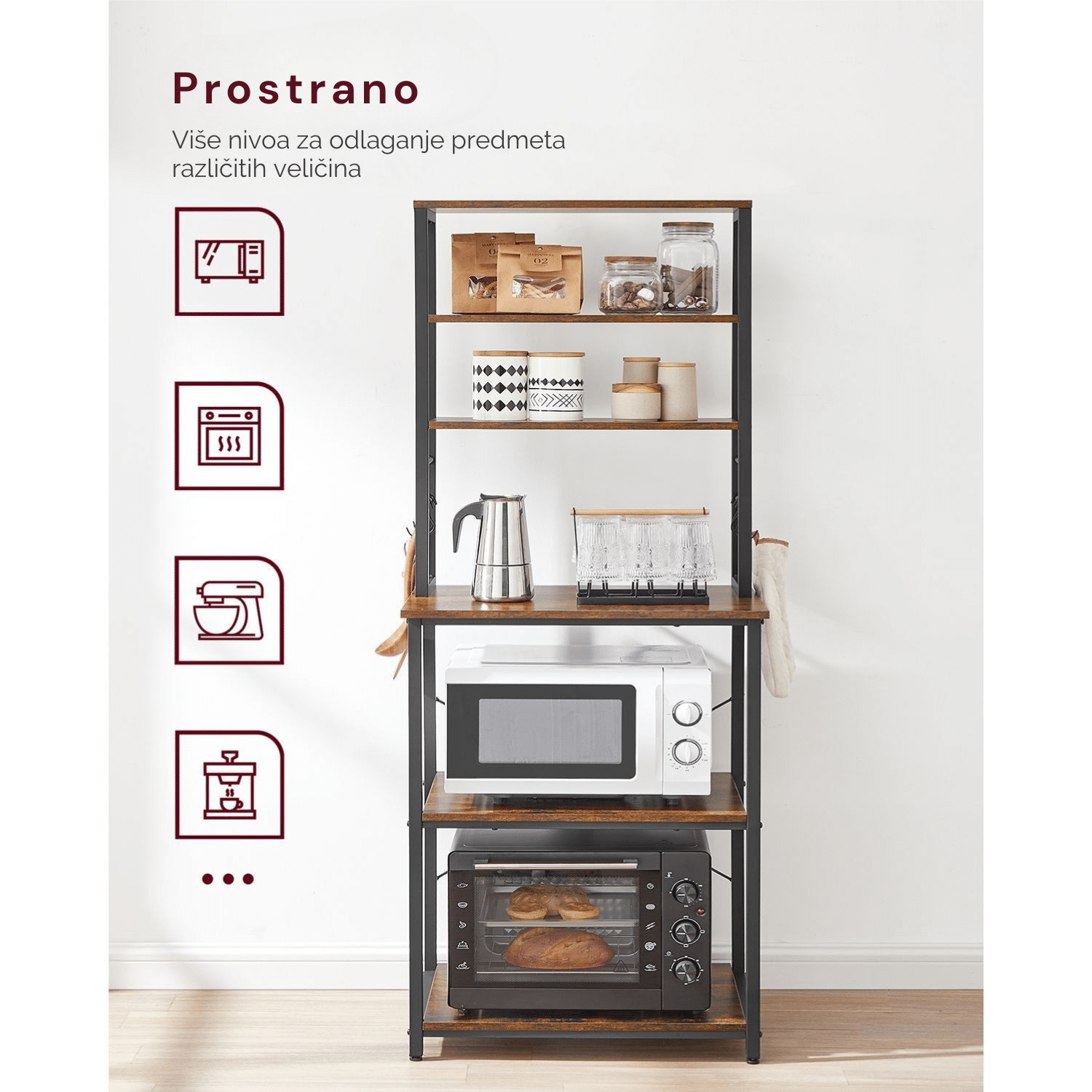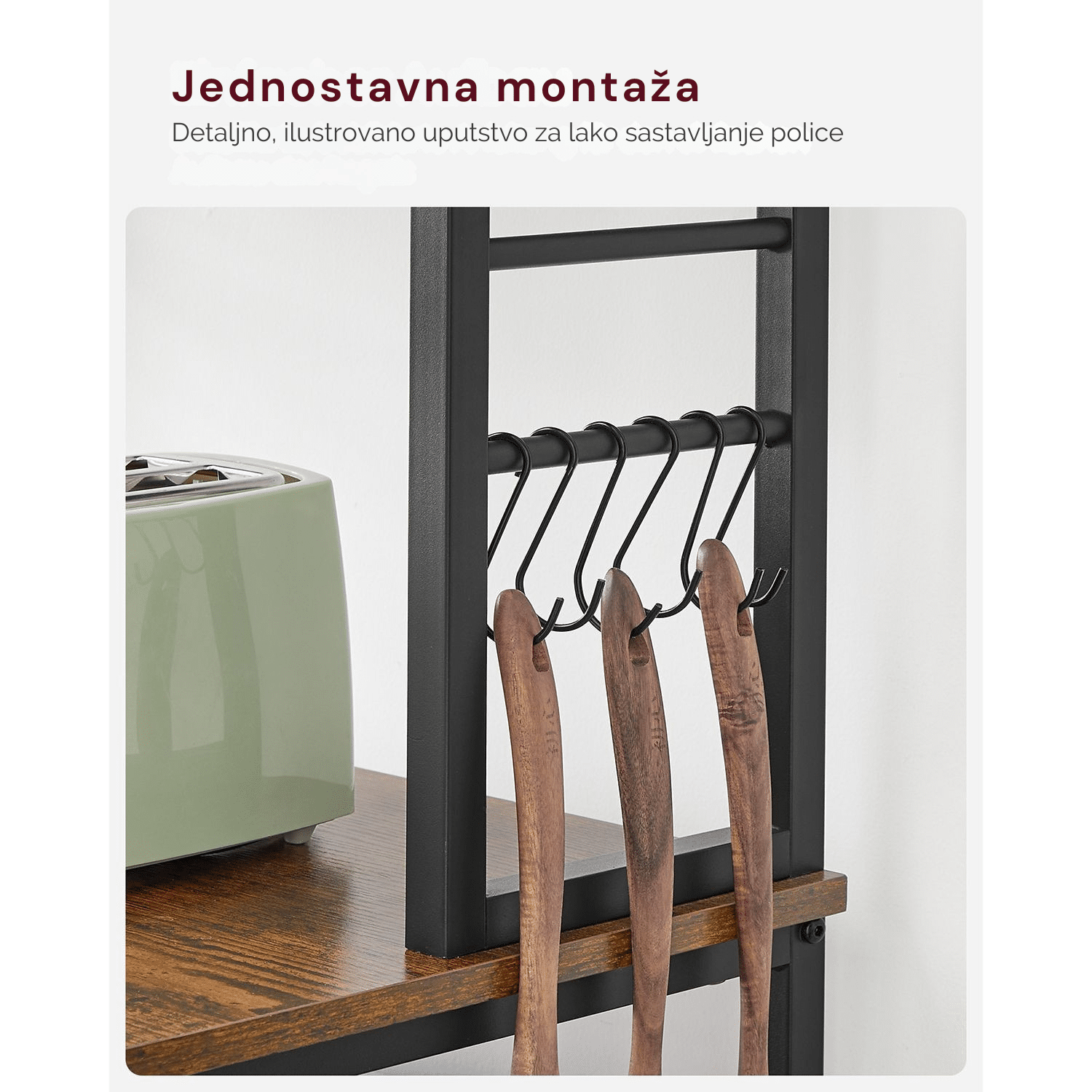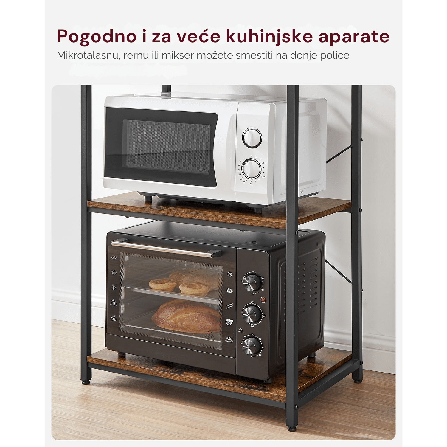 Čvrsta konstrukcija – Zahvaljujući kombinaciji robusnog čeličnog rama i izdržljive iverice, ova samostojeća kuhinjska polica je snažna i stabilna te bez problema može da nosi mikrotalasnu rernu, aparat za kafu i druge kuhinjske uređaje.