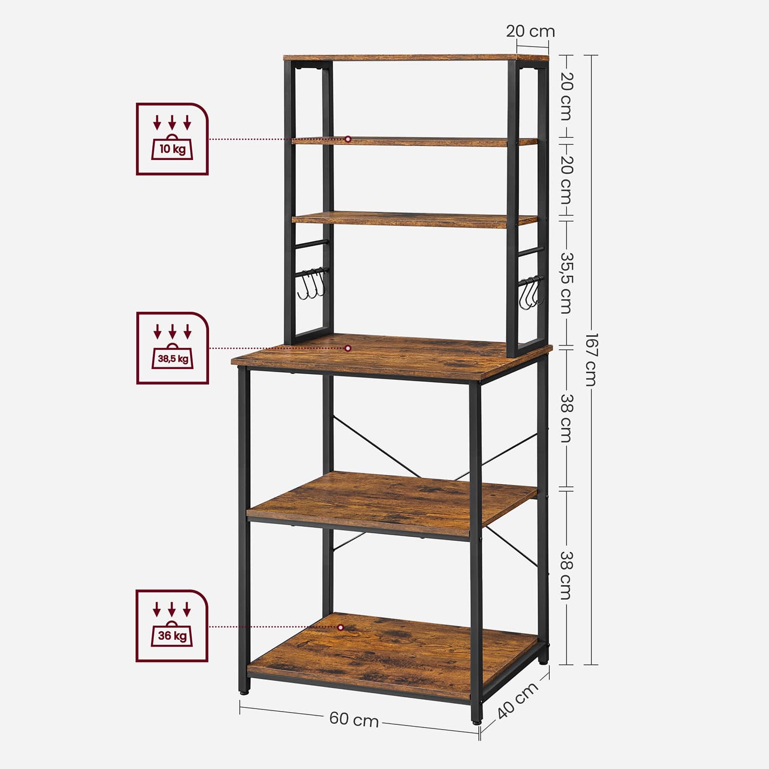 Pogodna za male prostore – Dimenzija 40 × 60 × 167 cm, ova kuhinjska polica sa 6 nivoa idealna je za manje kuhinje ili kao mini kafe-bar. Omogućava maksimalno iskorišćenje prostora.