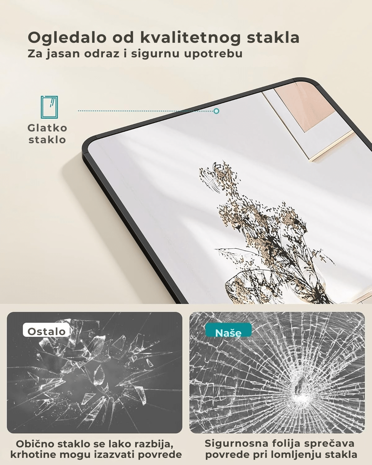 Čvrsto i bezbedno – izrađeno od kaljenog stakla visoke čvrstoće sa zaštitnom folijom, ovo ogledalo smanjuje rizik od rasipanja i obezbeđuje veću sigurnost čak i u slučaju lomljenja.