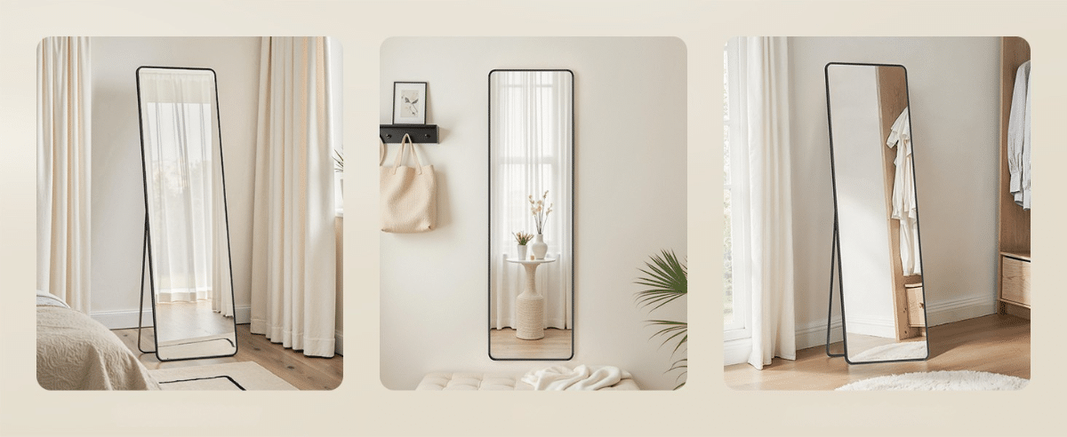 Pogledajte sebe u punoj veličini – ogledalo dimenzija 150 x 40 cm omogućava kompletan pregled vašeg outfita. Može se koristiti kao samostojeće ili montirati na zid, pružajući savršen odraz u svakom trenutku.