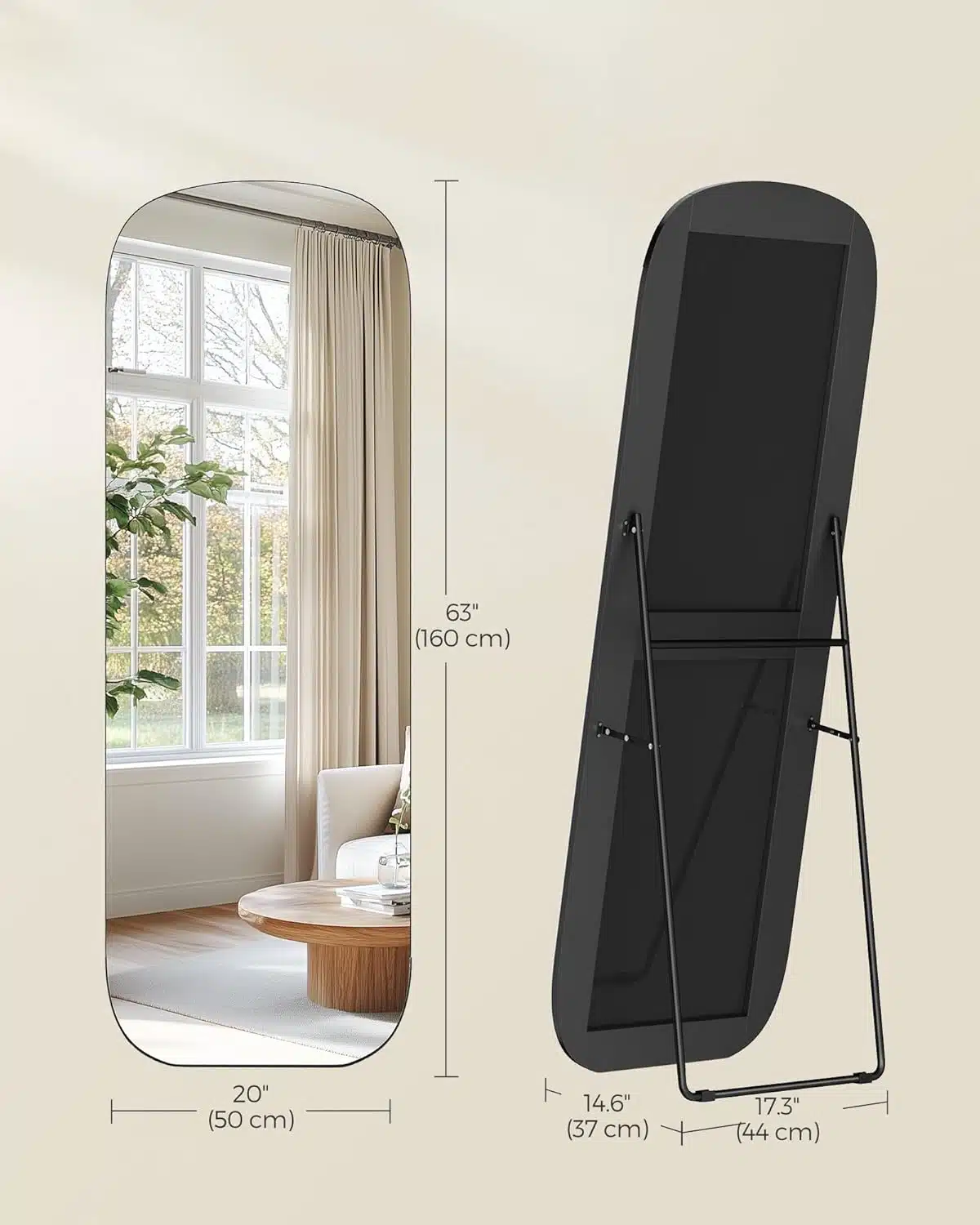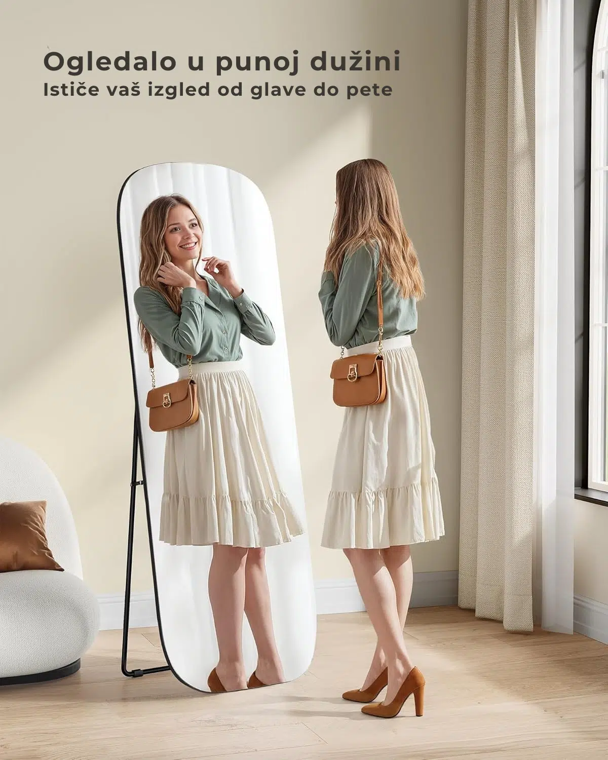 Sa dimenzijama 160 x 50 cm, ovo ogledalo u punoj dužini pruža kompletan pregled vašeg izgleda, omogućavajući vam da lako proverite svaki detalj pre izlaska.