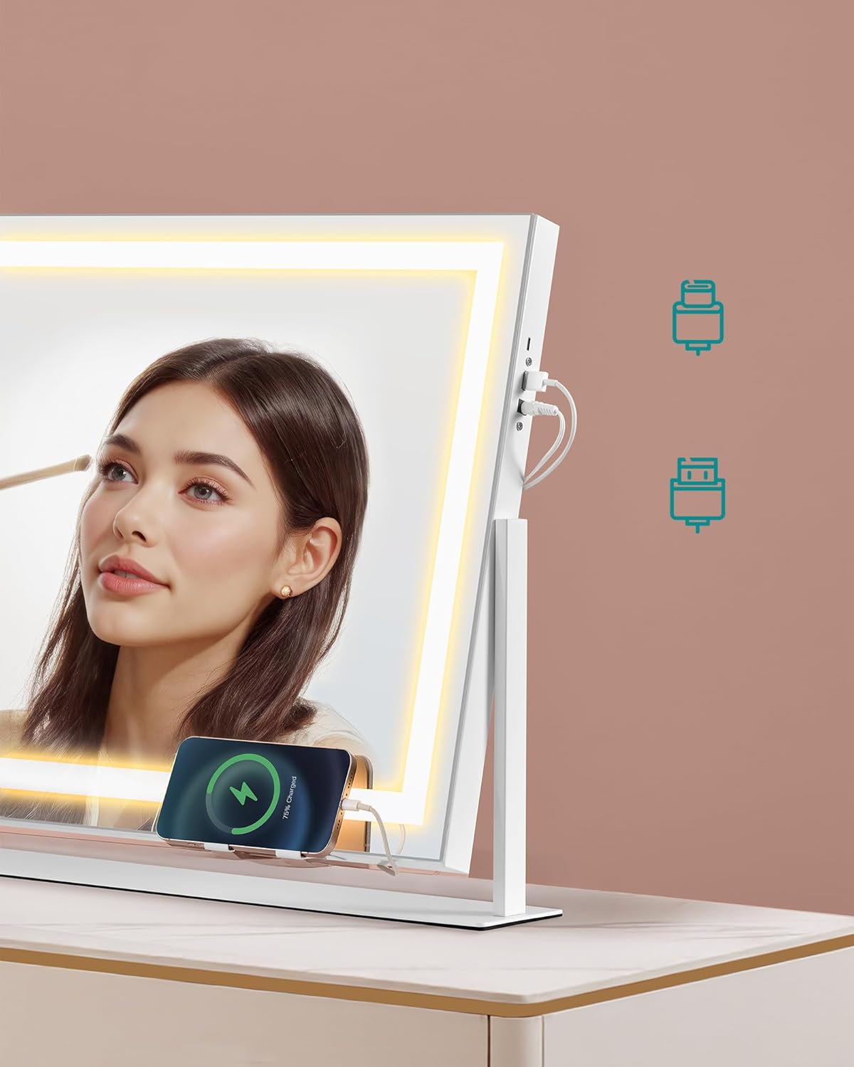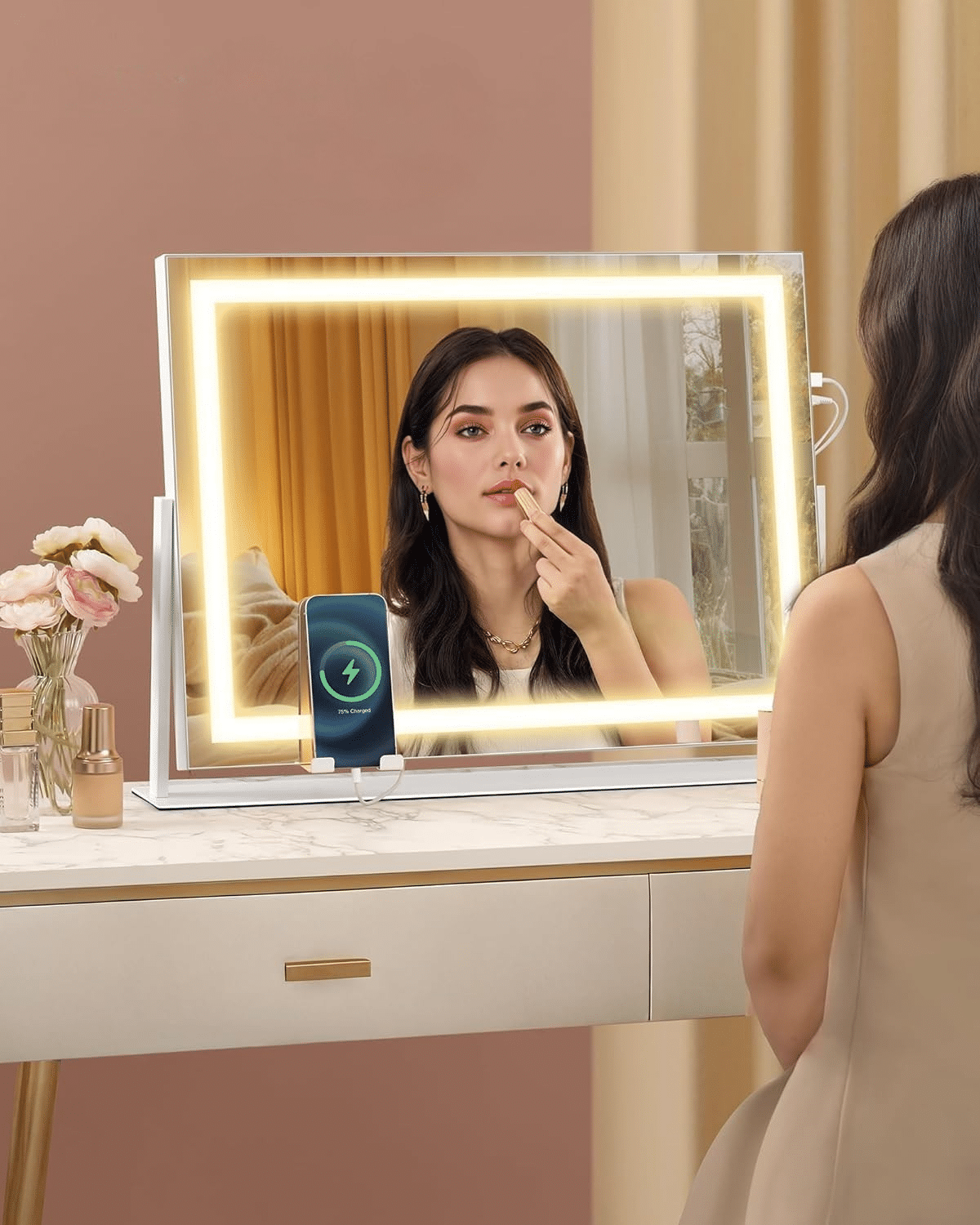 Jednostavno gledanje i punjenje – držač za telefon može se postaviti sa leve ili desne strane. Ugrađeni USB-A i USB-C port omogućavaju punjenje uređaja tokom vaše beauty rutine.