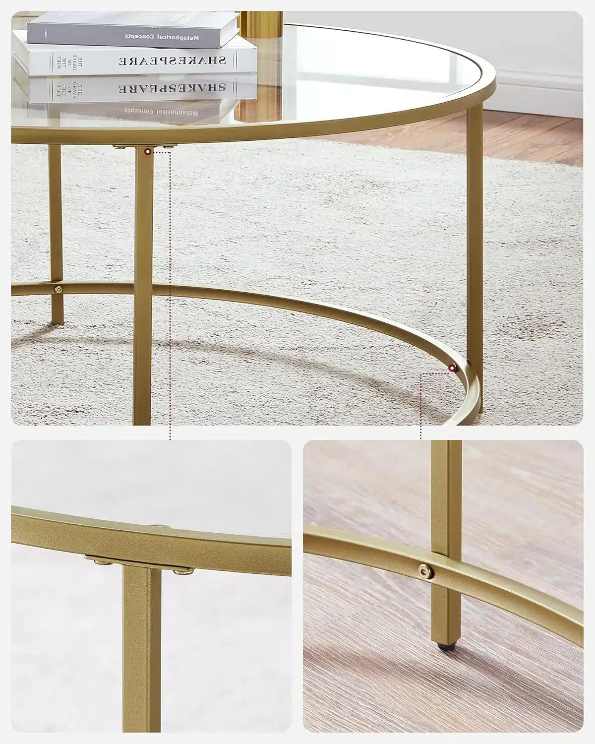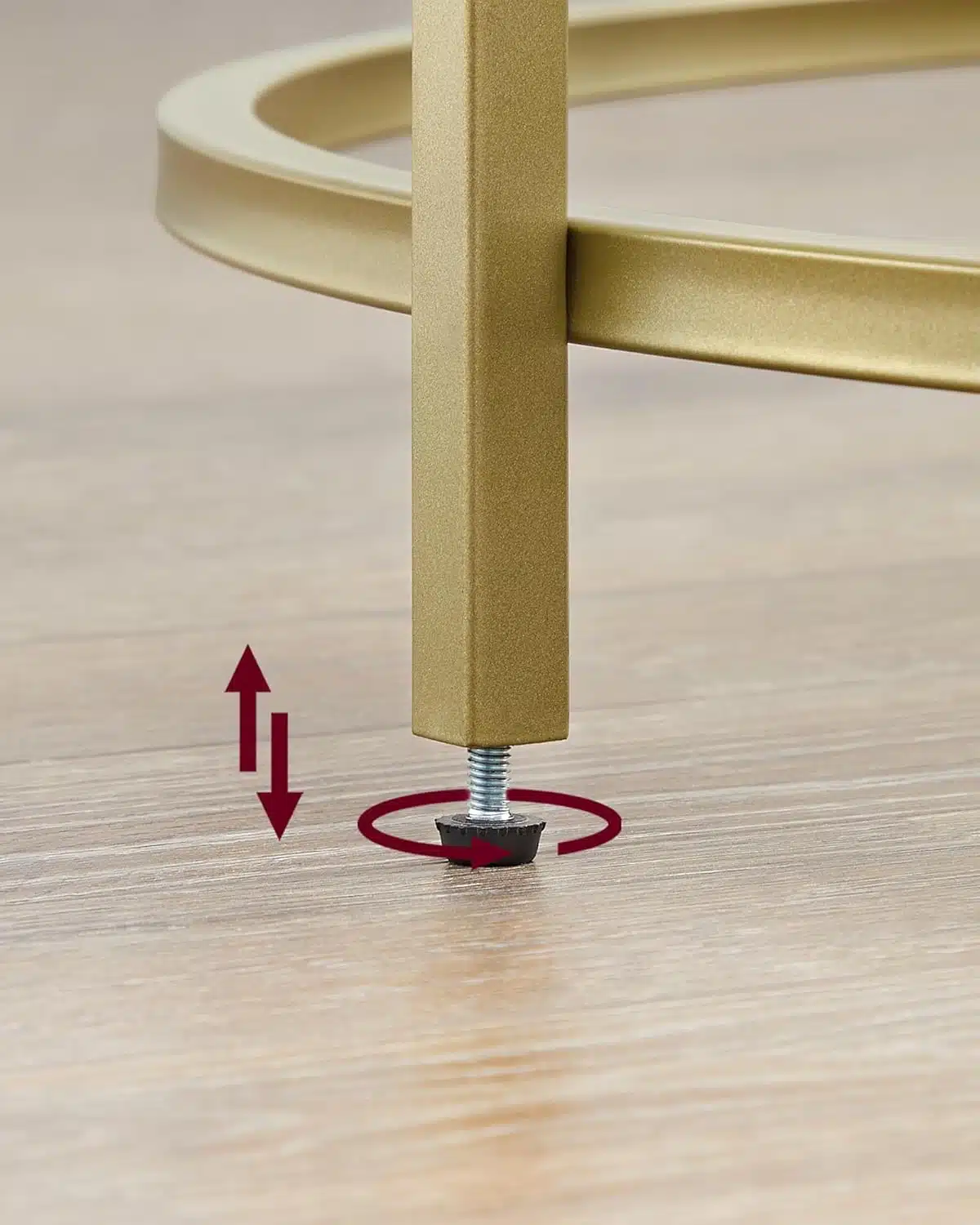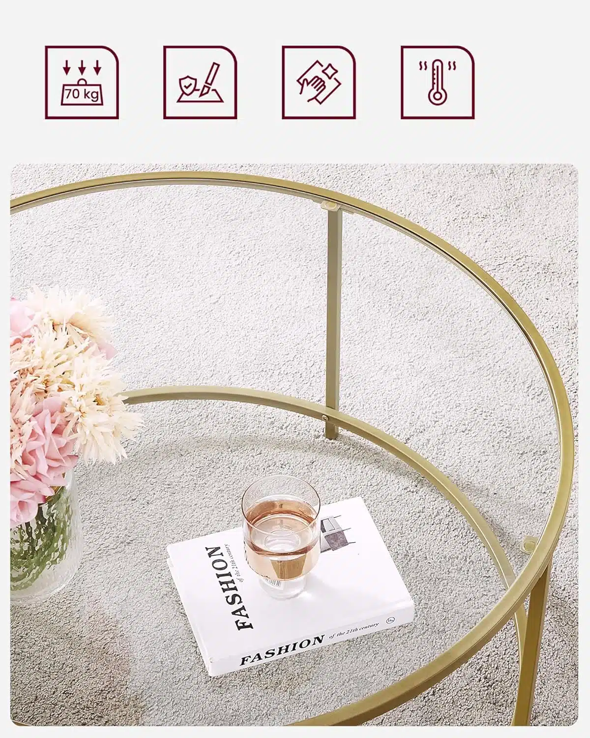 Zaobljen zlatni čelični okvir i kaljena staklena ploča čine savršen spoj elegancije i modernog dizajna. Ovaj sto unosi luksuzan i sofisticiran izgled u svaki prostor, bilo da ga postavite u dnevnu sobu ili pored sofe.