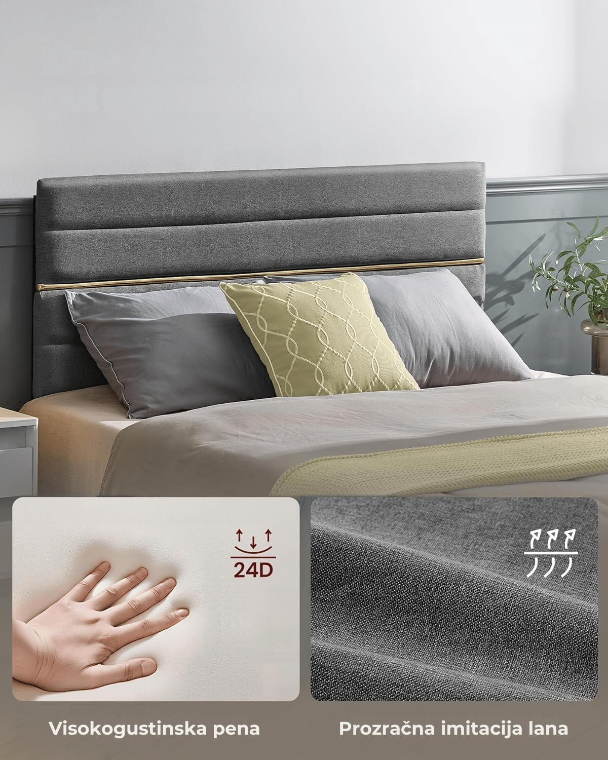 Udoban i moderan dizajn – uzglavlje presvučeno prozračnom tkaninom (imitacija lana) i ispunjeno penom visoke gustine pruža maksimalnu udobnost pri oslanjanju. Čiste linije i dekorativni zlatni detalji unose eleganciju u svaku spavaću sobu.