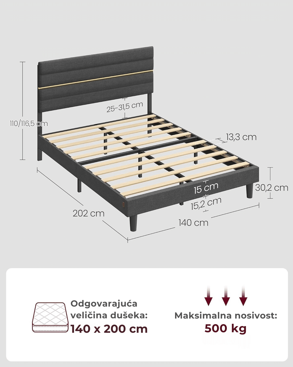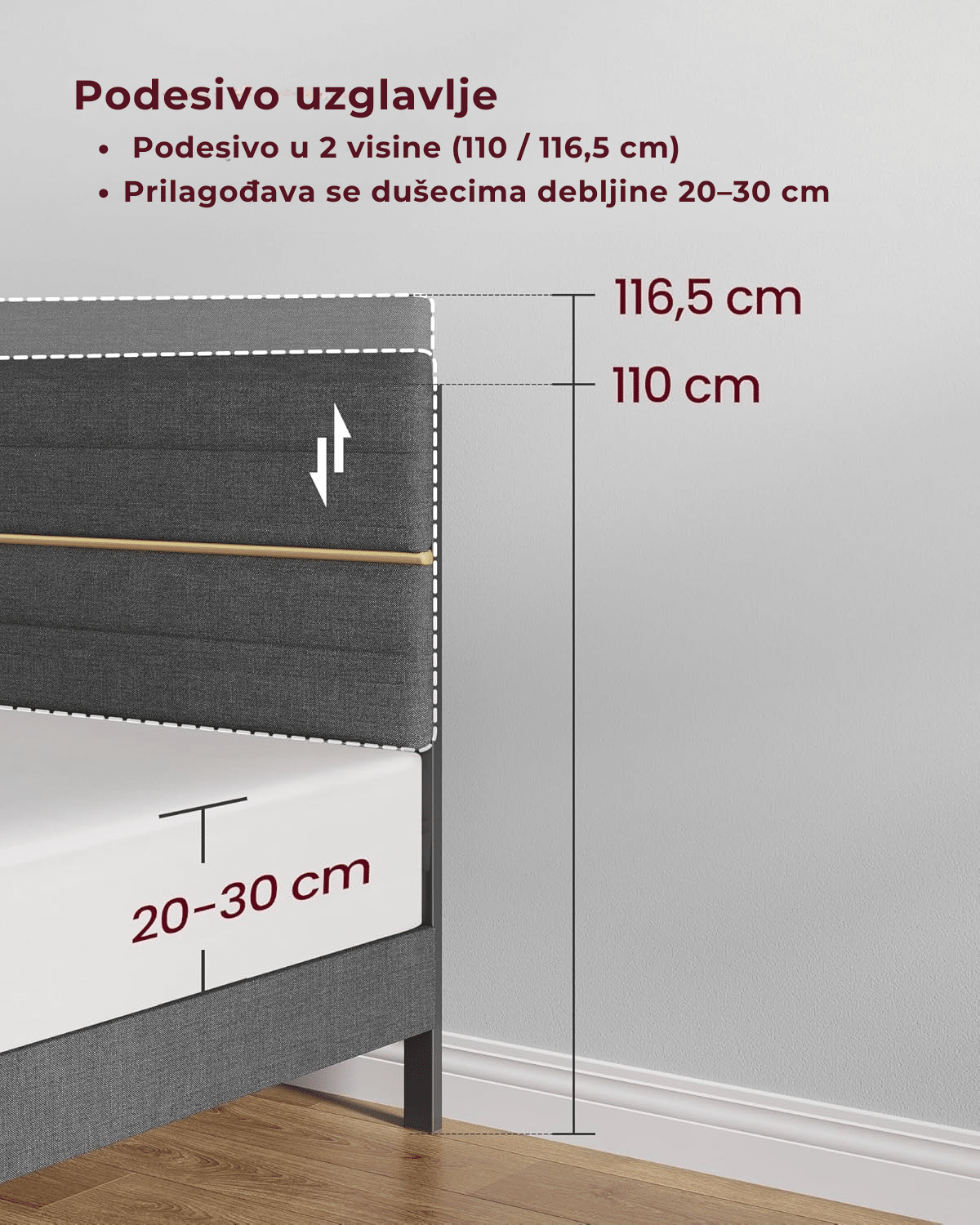 Podesivo uzglavlje – visina uzglavlja može se podešavati u dva nivoa (110 / 116.5 cm), što omogućava prilagođavanje dušecima debljine od 25 do 31.5 cm.