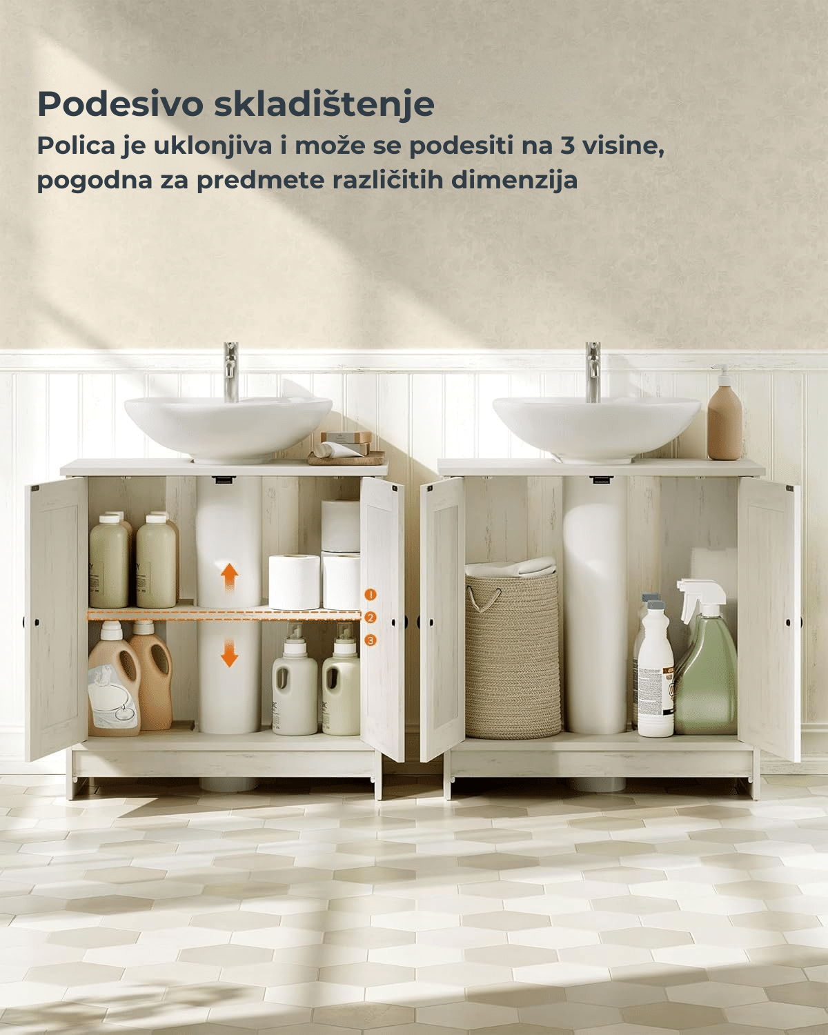 Prilagodljivo skladištenje – srednja polica je uklonjiva i podesiva na 3 visine, što omogućava lako odlaganje i viših boca šampona i manjih peškira, uz maksimalnu organizaciju prostora.