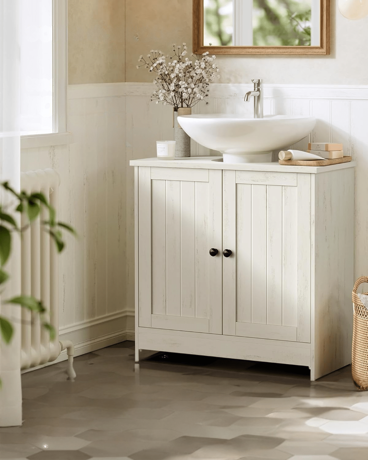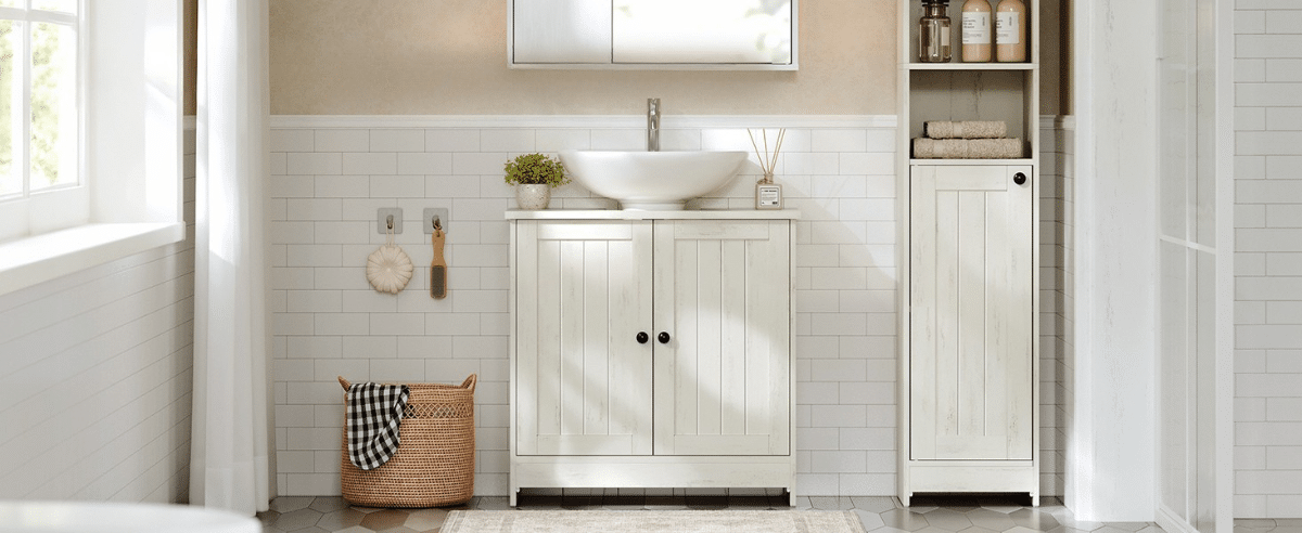 Moderan farmhouse stil – spoj rustikalnog šarma i moderne jednostavnosti. Vintage ručke, dekorativne linije i topla završna obrada daju kupatilu prijatan i elegantan izgled.