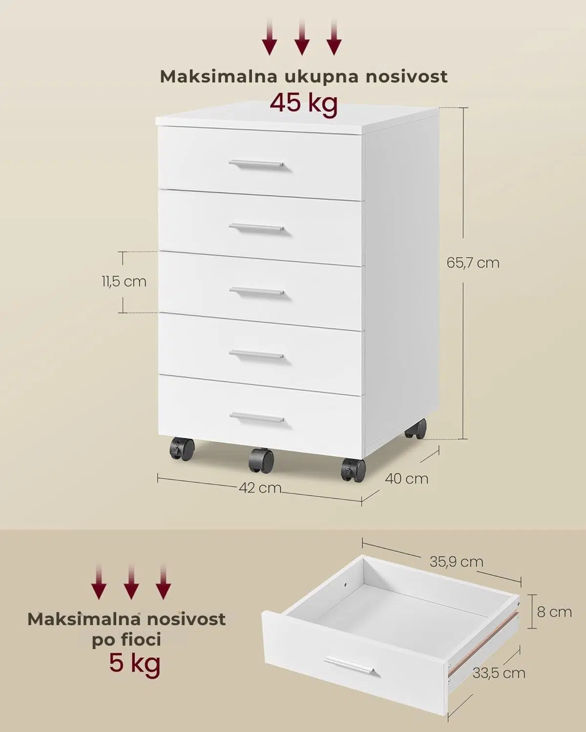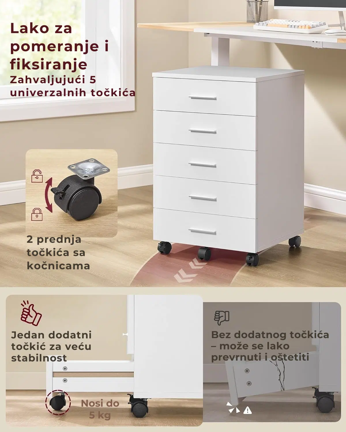 Izrađen od kvalitetnih materijala, ovaj fiokar pruža odličnu stabilnost i nosivost do 45 kg, što ga čini pogodnim i za odlaganje štampača ili druge opreme. Dodatni točkić ispod donje fioke povećava stabilnost i sprečava prevrtanje čak i tokom pomeranja.