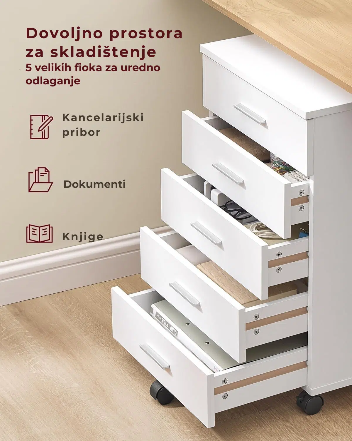 Sa pet prostranih fioka, ovaj fiokar omogućava uredno odlaganje dokumenata, kancelarijskog pribora i drugih sitnica. Kompaktna visina od 60 cm omogućava da se lako smesti ispod standardnog radnog stola, čime se maksimalno iskorišćava prostor bez gužve.