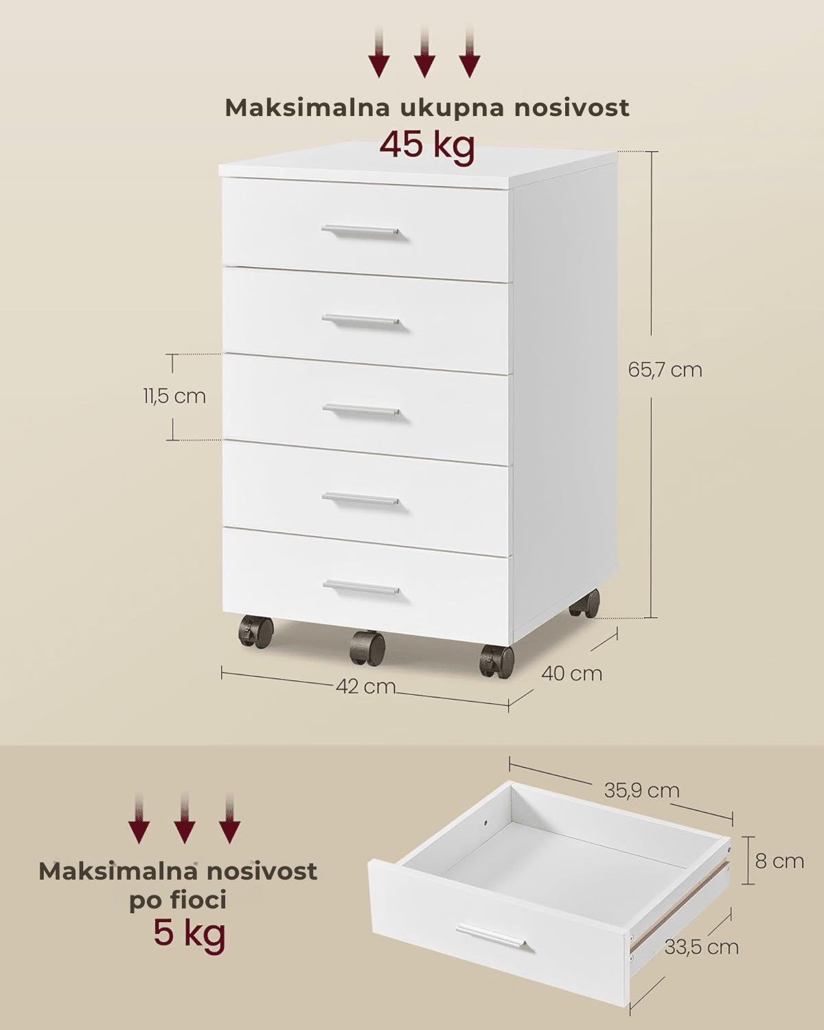 Izrađen od kvalitetnih materijala, ovaj fiokar pruža odličnu stabilnost i nosivost do 45 kg, što ga čini pogodnim i za odlaganje štampača ili druge opreme. Dodatni točkić ispod donje fioke povećava stabilnost i sprečava prevrtanje čak i tokom pomeranja.