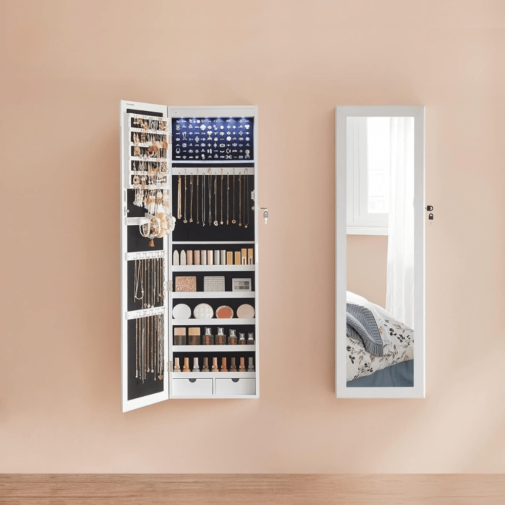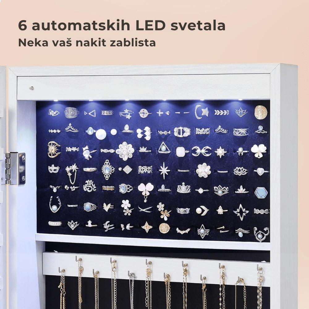 Unesite red i eleganciju u svoj prostor uz moderan ormarić za nakit sa ogledalom i LED osvetljenjem. Ovaj funkcionalan i estetski privlačan organizator omogućava vam da sav vaš nakit bude uredno složen, lako dostupan i savršeno osvetljen u svakom trenutku.
