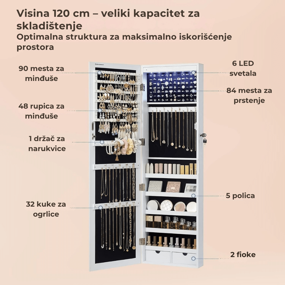 Sa visinom od 120 cm, ovaj ormarić nudi veliki kapacitet za skladištenje i savršenu organizaciju. U unutrašnjosti se nalaze držači i pregrade za različite vrste nakita, uključujući prostor za prstenje, narukvice, ogrlice i minđuše, kao i praktične fioke i police za dodatke.