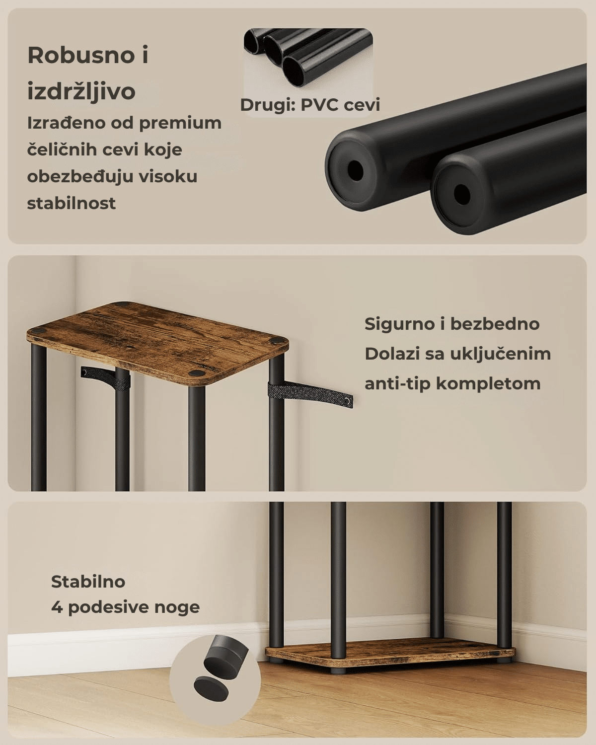 Konstrukcija je izrađena od ojačanih čeličnih cevi i kvalitetne iverice, što obezbeđuje dugotrajnost i stabilnost u svakodnevnoj upotrebi. Svaka polica može da podnese opterećenje do 6 kg, dok ukupna nosivost iznosi 36 kg. Dodatnu stabilnost pružaju podesive nožice koje omogućavaju ravnotežu čak i na neravnim površinama, čineći policu sigurnom i pouzdanom.