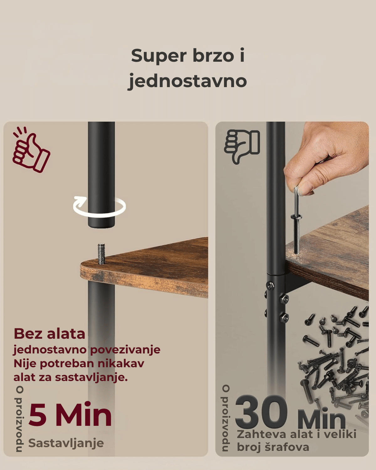 Ova polica sa 6 nivoa predstavlja savršen spoj praktičnosti, stabilnosti i modernog dizajna, kreirana za sve koji žele funkcionalno rešenje za organizaciju bez komplikovane montaže. Zahvaljujući inovativnom sistemu sklapanja bez alata, policu možete postaviti za svega nekoliko minuta. Cevi se jednostavno povezuju pomoću dvostranih vijaka, bez potrebe za šrafovima ili dodatnim alatima, što čini ceo proces brz, jednostavan i intuitivan – gotovo kao slaganje kockica.