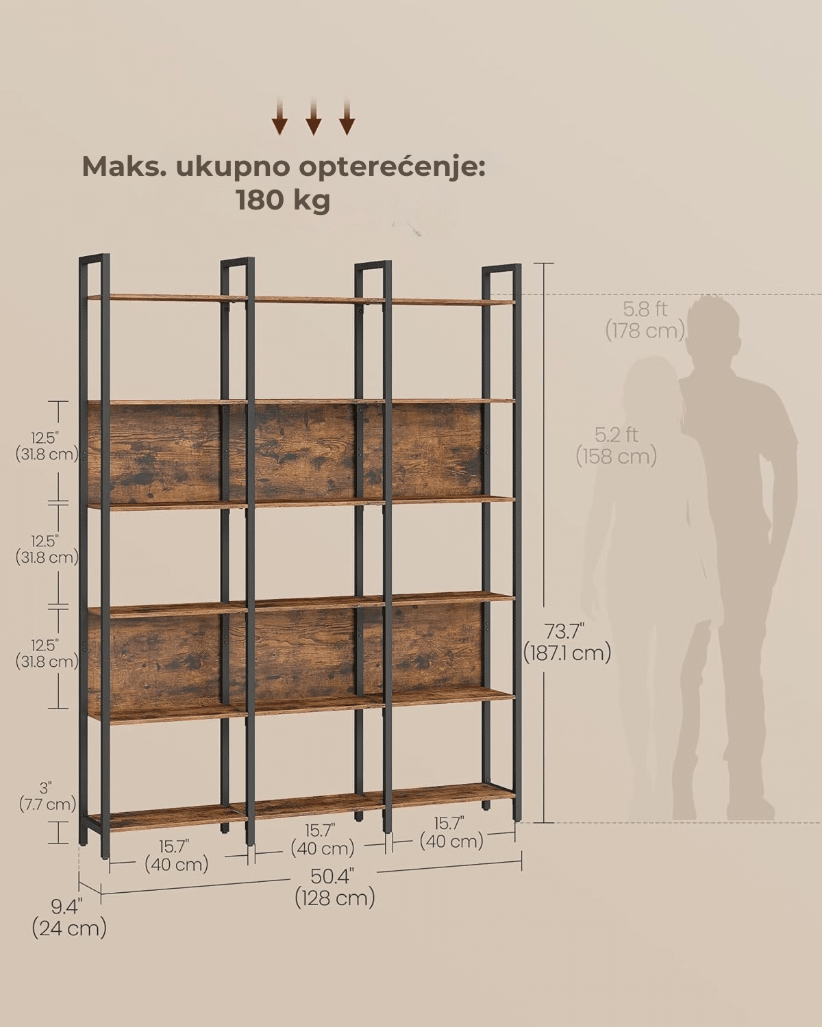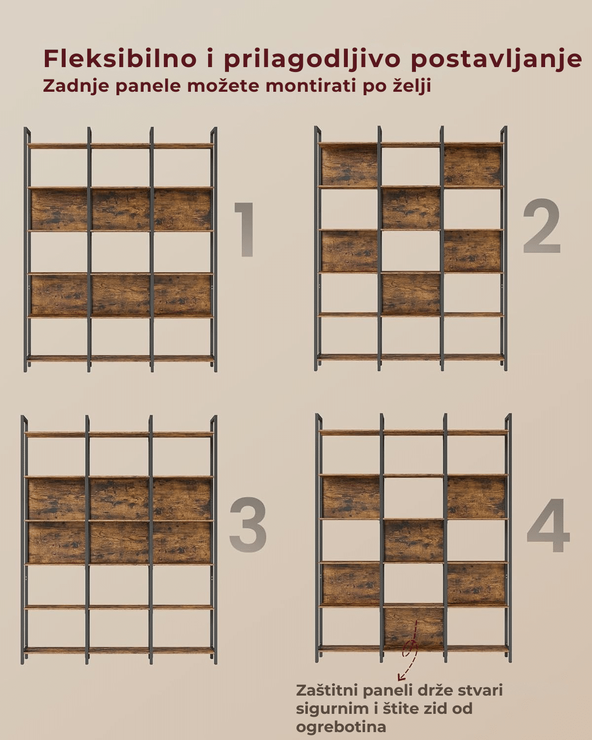Prostrano i prilagodljivo skladištenje – ova velika polica dimenzija 24 x 128 x 187.1 cm nudi dovoljno prostora za knjige i druge predmete, dok se zadnji paneli mogu fleksibilno montirati prema vašim potrebama.