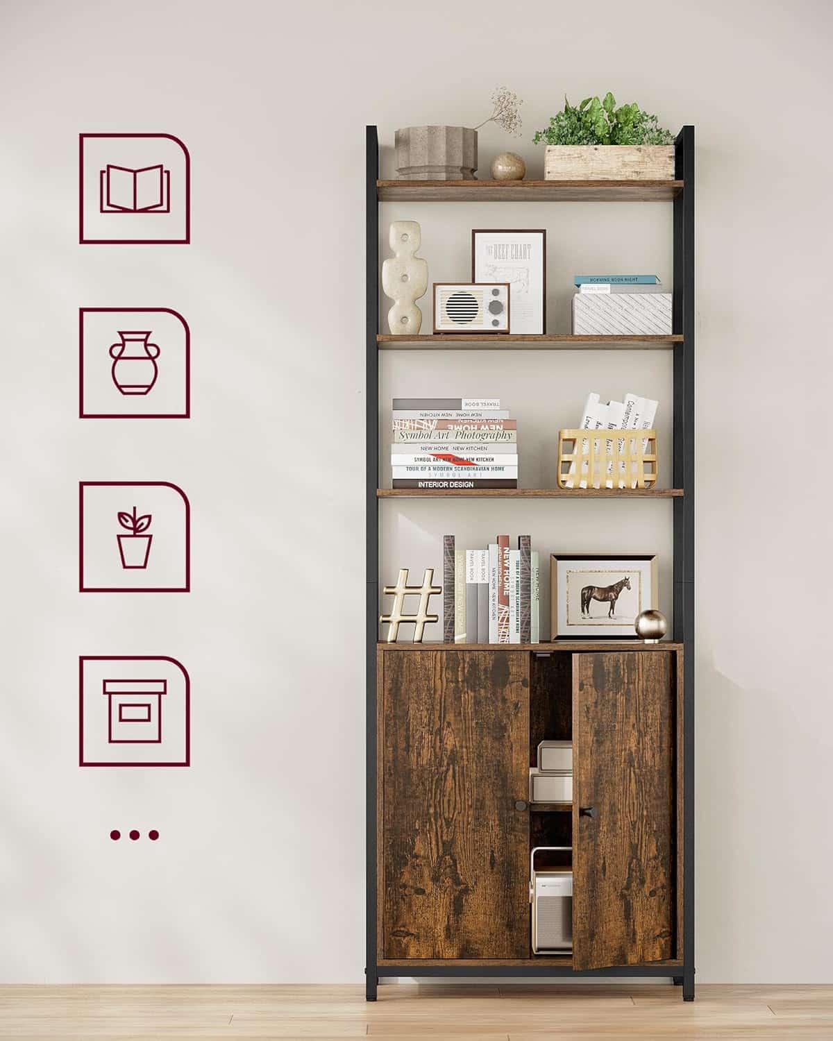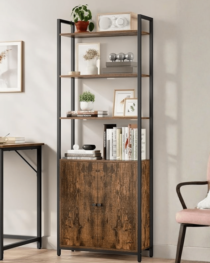 Sa metalnim okvirom u ink crnoj boji i policama u rustično braon tonu, ova polica za knjige ima jednostavan, ali upečatljiv izgled koji se lako uklapa u različite stilove enterijera – od industrijskog do modernog.