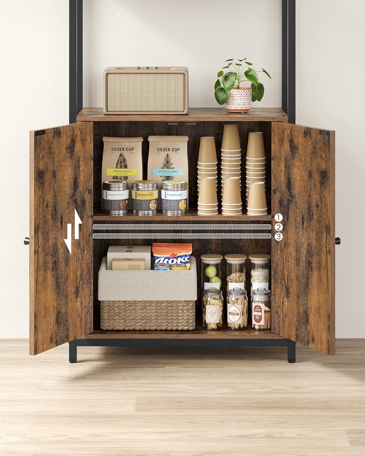 Polica je opremljena podesivim nogicama koje omogućavaju stabilnost čak i na neravnim podovima. Tu je i anti-tip set za pričvršćivanje za zid, koji sprečava prevrtanje i čini prostor sigurnijim.