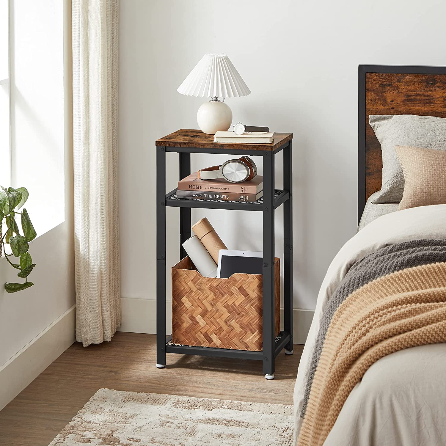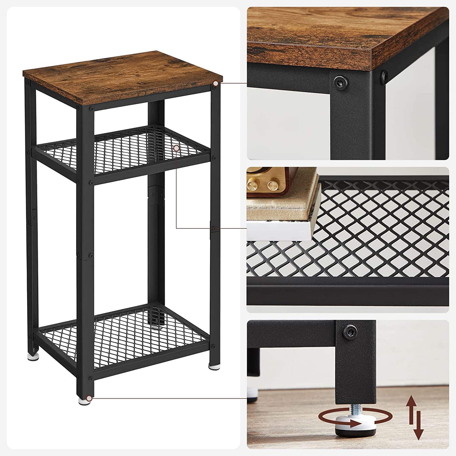 Ovaj pomoćni sto sa 3 nivoa kombinuje rustično inženjersko drvo sa metalnim policama i ramom u industrijskom stilu, stvarajući klasičan i upečatljiv izgled. Na gornju ploču možete postaviti lampu, na srednju policu daljinske upravljače, a na donju knjige, kako bi stočić bio maksimalno iskorišćen.