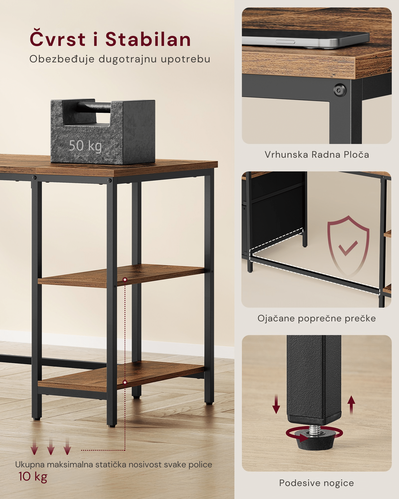 Čvrsta i izdržljiva konstrukcija – Izrađen od kvalitetne iverice i snažnog čeličnog rama, ovaj radni sto može da nosi do 50 kg na radnoj površini i do 10 kg po polici.