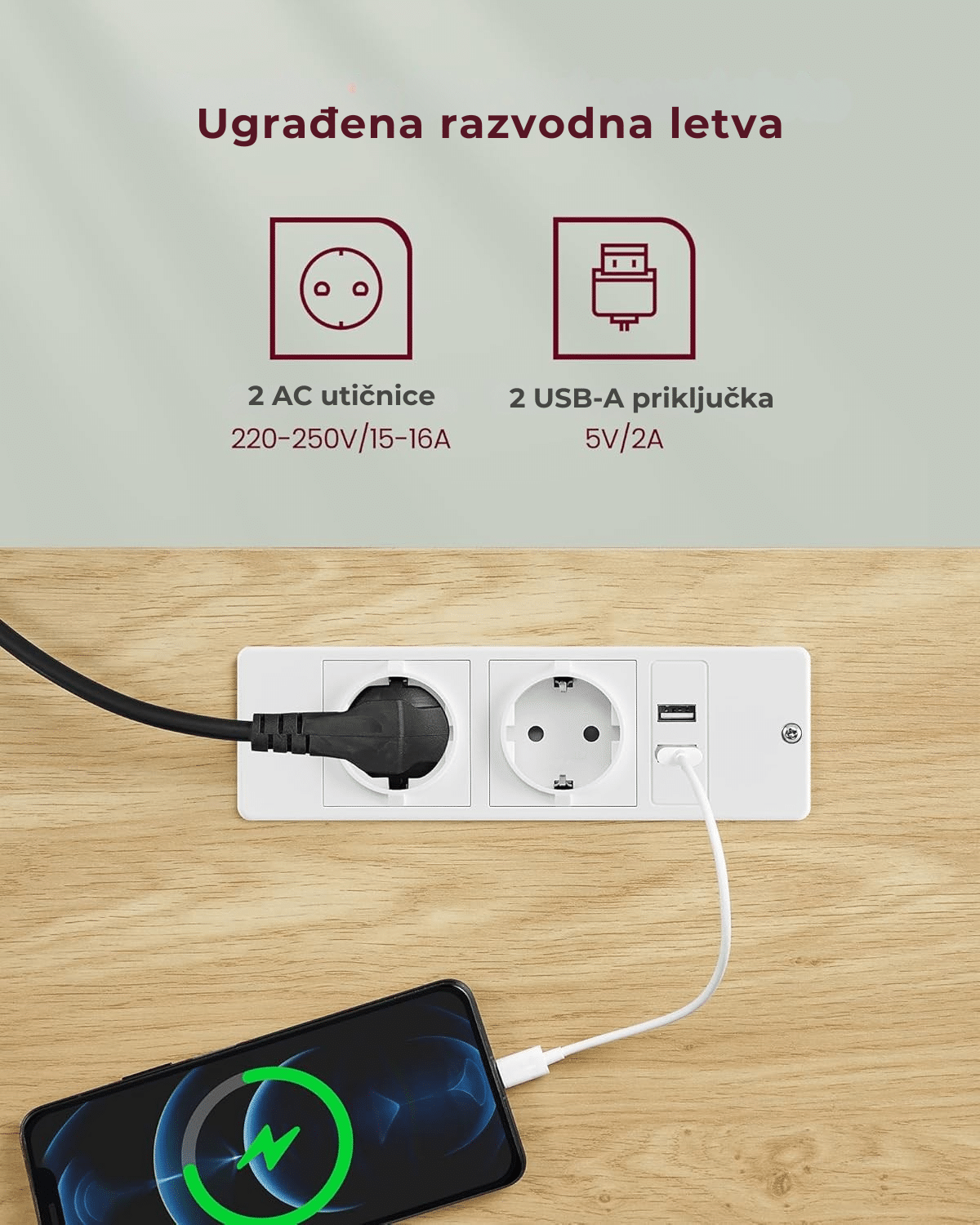 Ovaj model dolazi sa integrisanim utičnicama i USB portovima, što dodatno povećava njegovu praktičnost. Dve utičnice i dva USB priključka omogućavaju jednostavno povezivanje i punjenje uređaja direktno sa stola, bez potrebe za dodatnim produžnim kablovima. Zahvaljujući pametno integrisanom kablu, sve funkcije su objedinjene kroz jedan priključak, što doprinosi urednom i organizovanom radnom prostoru.