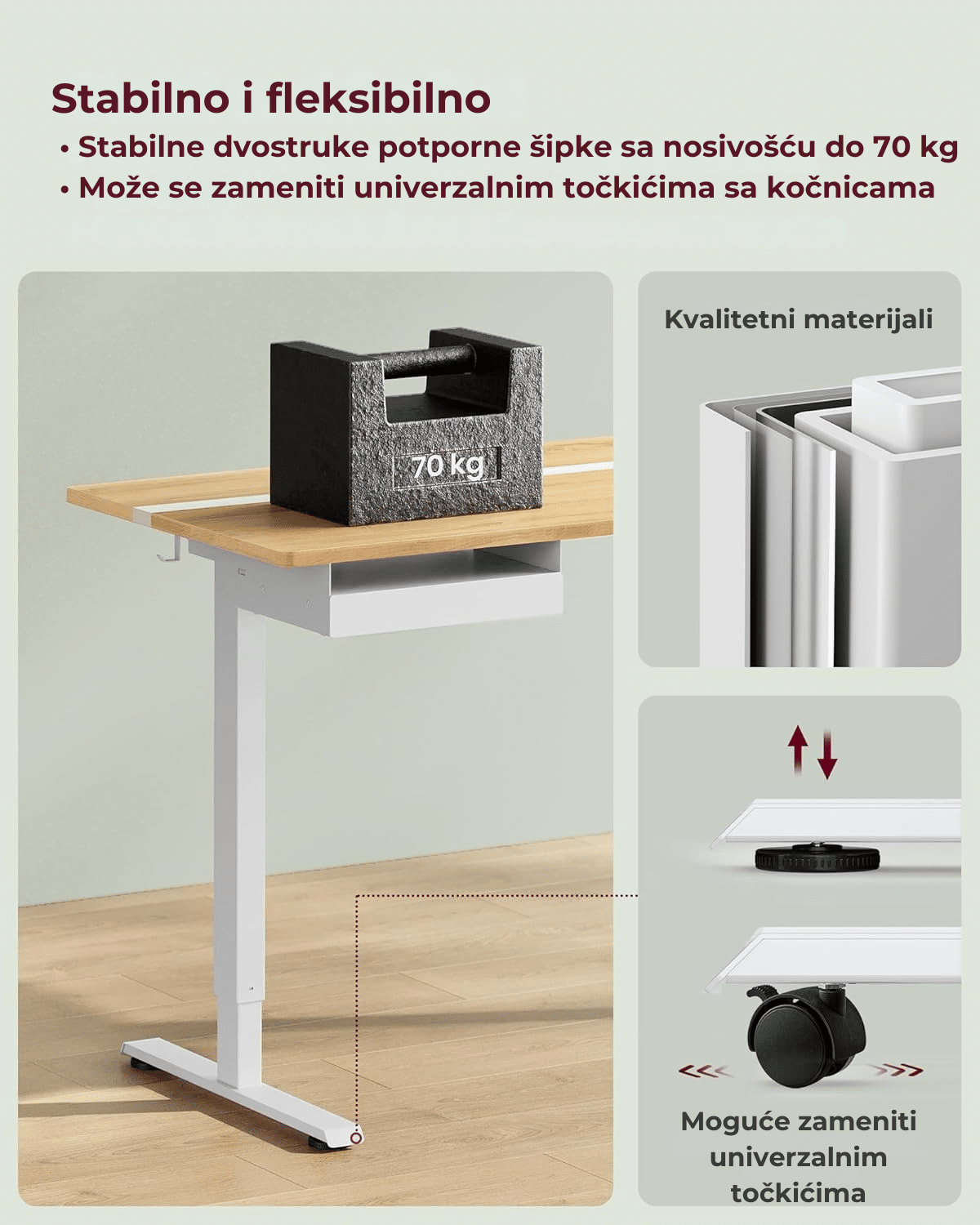 Konstrukcija stola je izuzetno stabilna i izdržljiva, zahvaljujući dvostrukim potpornim gredama i čvrstim nogama. Može da podnese opterećenje do 80 kg, što ga čini pogodnim za više monitora i kompletnu radnu opremu. Podesive nogice omogućavaju stabilnost čak i na neravnim površinama, a po potrebi se mogu zameniti točkićima sa kočnicama za lakše pomeranje bez gubitka sigurnosti.