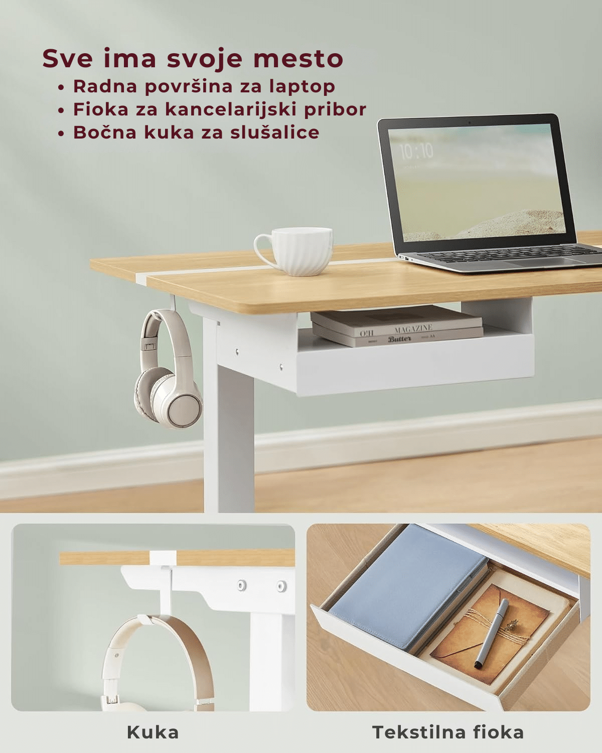 Praktični detalji dodatno unapređuju funkcionalnost. Fioka dimenzija 22.7 x 32.5 x 4.0 cm idealna je za odlaganje kancelarijskog pribora, dok prostrana radna površina pruža dovoljno mesta za laptop, dokumenta i dodatnu opremu. Bočna kuka omogućava kačenje slušalica ili torbe, čime sve što vam je potrebno ostaje na dohvat ruke.