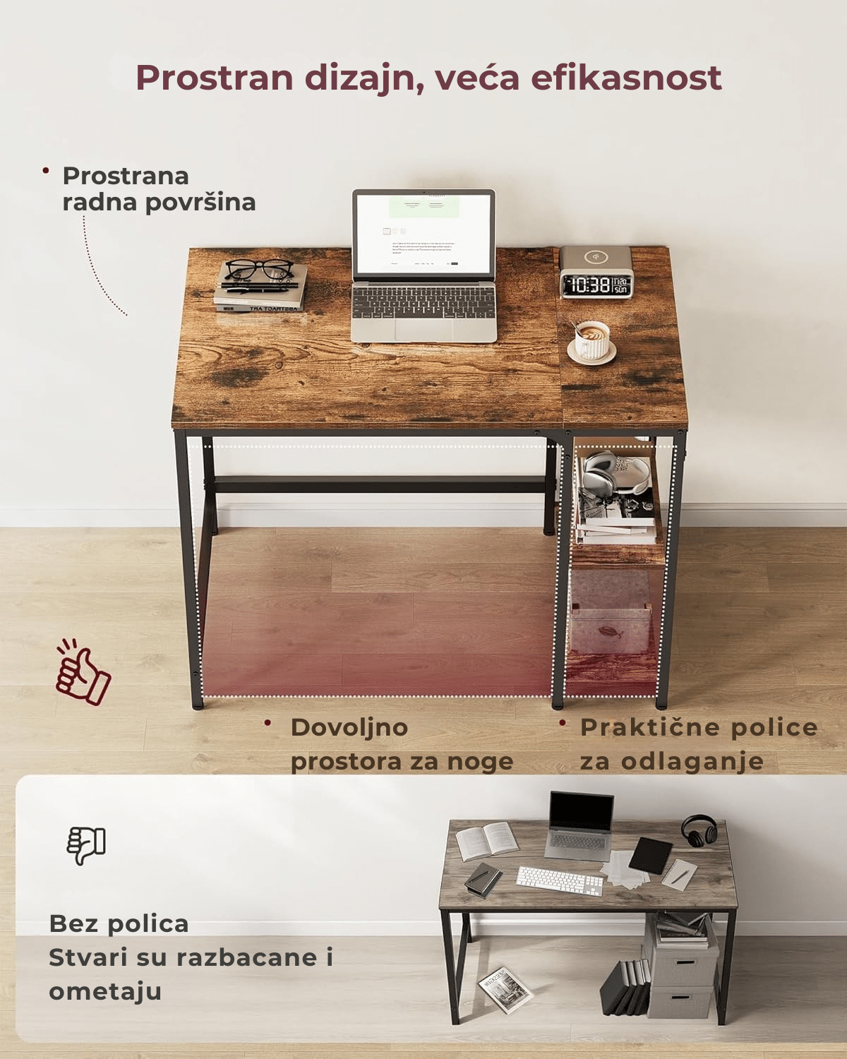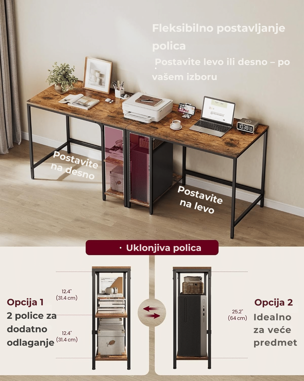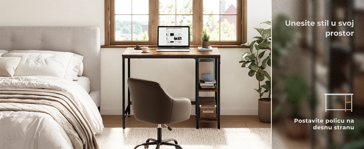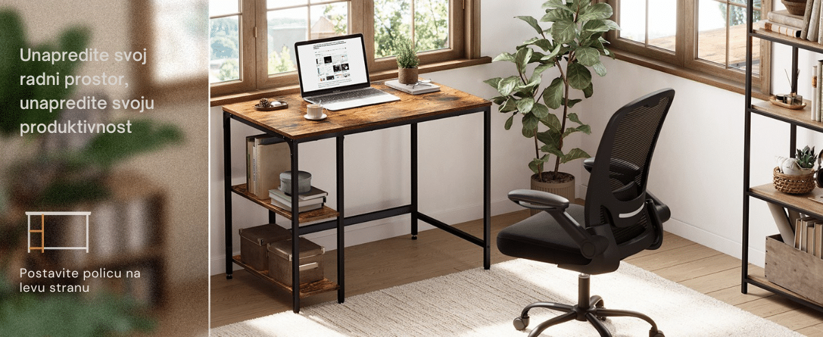 Prostrana radna površina i dve dodatne police omogućavaju brz pristup svim dokumentima i stvarima. Gornju policu možete ukloniti kako biste napravili mesto za kućište računara.