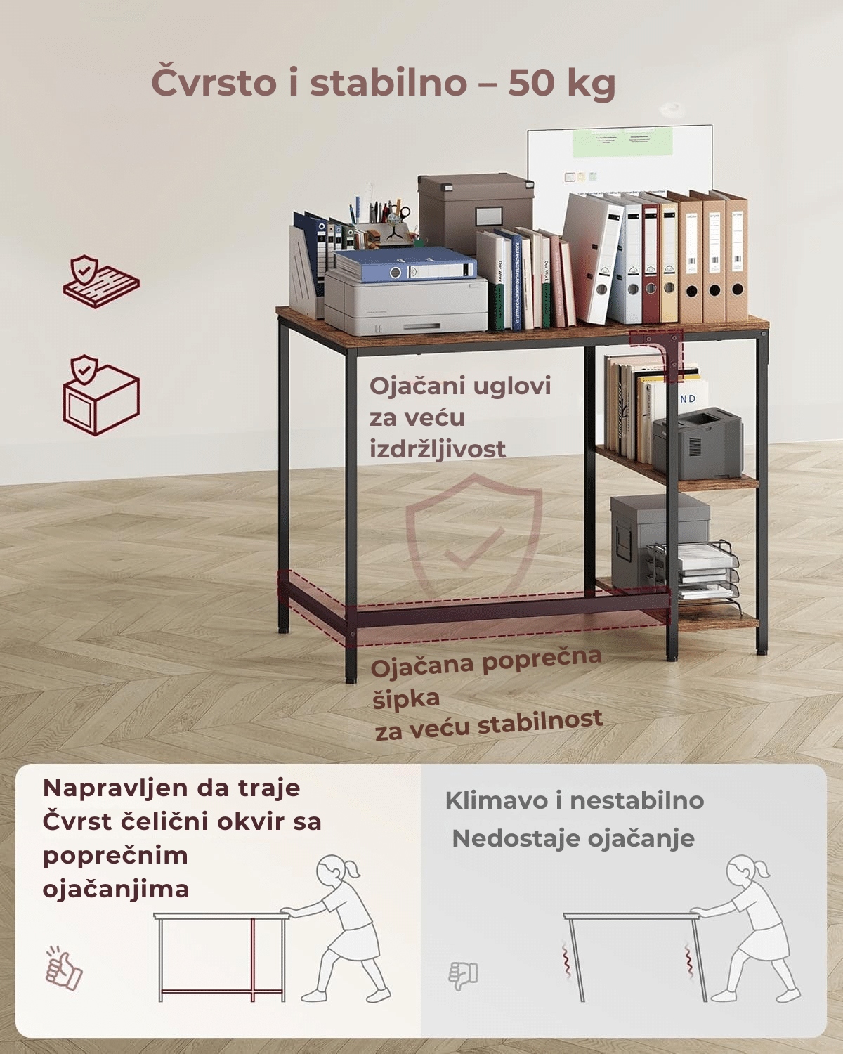Metalni okvir debljine 1,2 mm, čvrste ploče i podesive nožice obezbeđuju stabilnost – bez pomeranja pri svakom kliku ili radu.