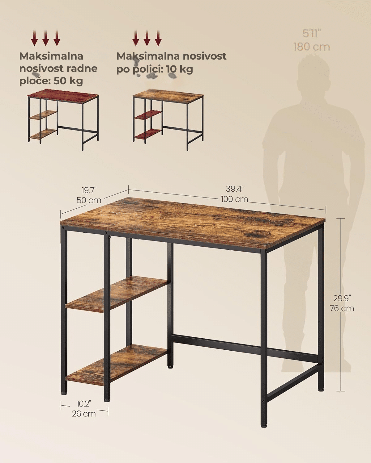 Ovaj elegantan radni sto kombinuje čvrst metal i rustik braon površinu, donoseći moderan industrijski izgled u vaš prostor. Sedite za sto sa sigurnošću da ste napravili pravi izbor.
