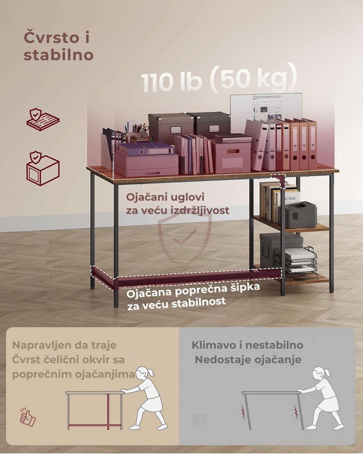 Stabilan čelični okvir i kvalitetna iverica obezbeđuju dugotrajnost i sigurnost. Sto bez problema podnosi sve što vam je potrebno za rad, učenje ili zabavu.