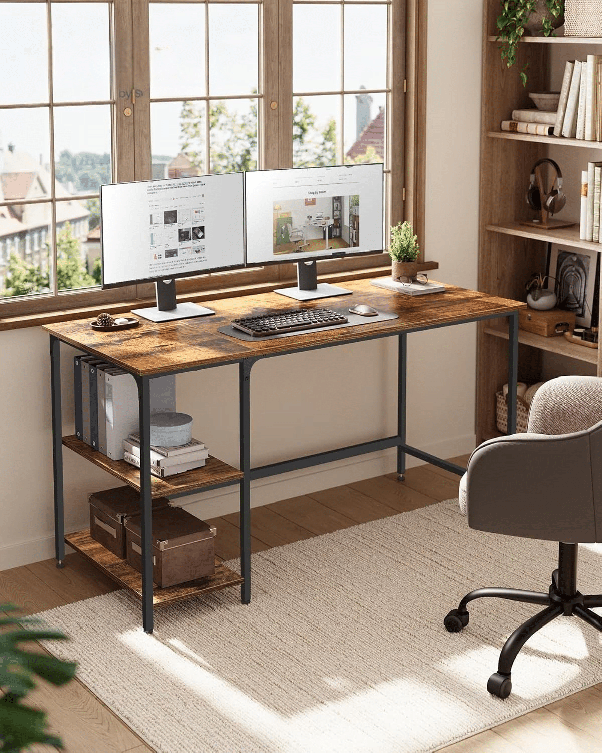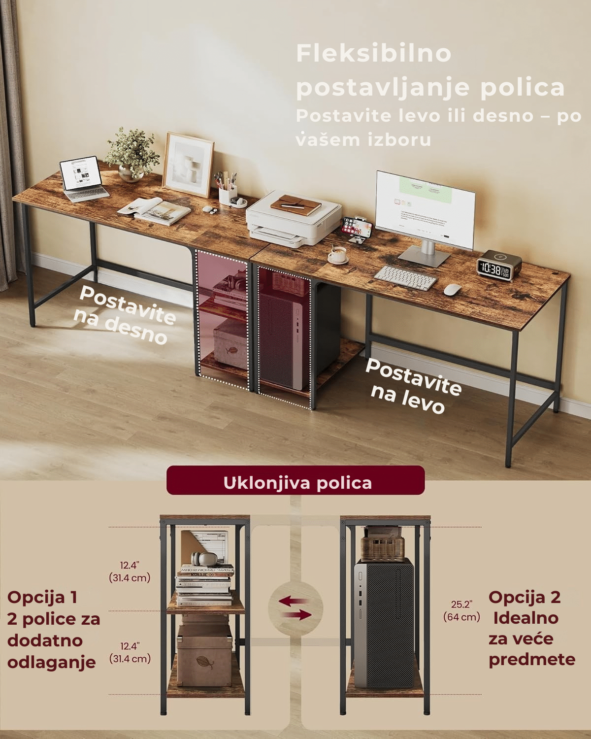Dve police za odlaganje, od kojih je jedna uklonjiva, mogu se montirati na levu ili desnu stranu prema vašim potrebama. Srednju policu možete ukloniti kako biste smestili kućište računara ili je zadržati za knjige, dokumenta i druge često korišćene stvari.