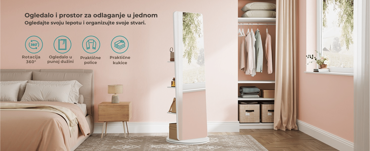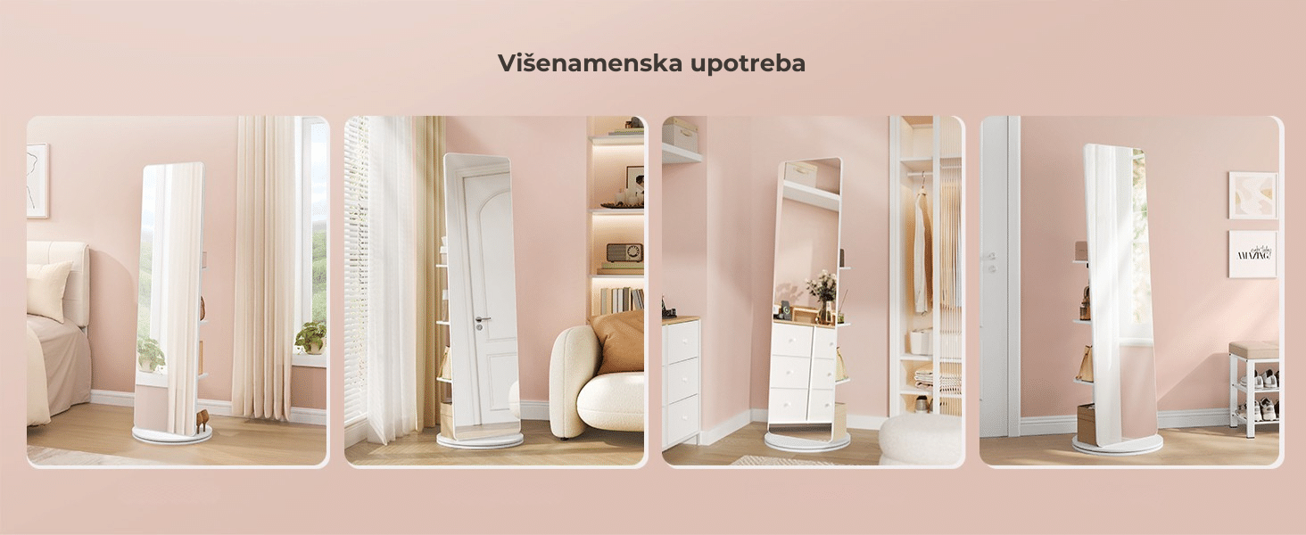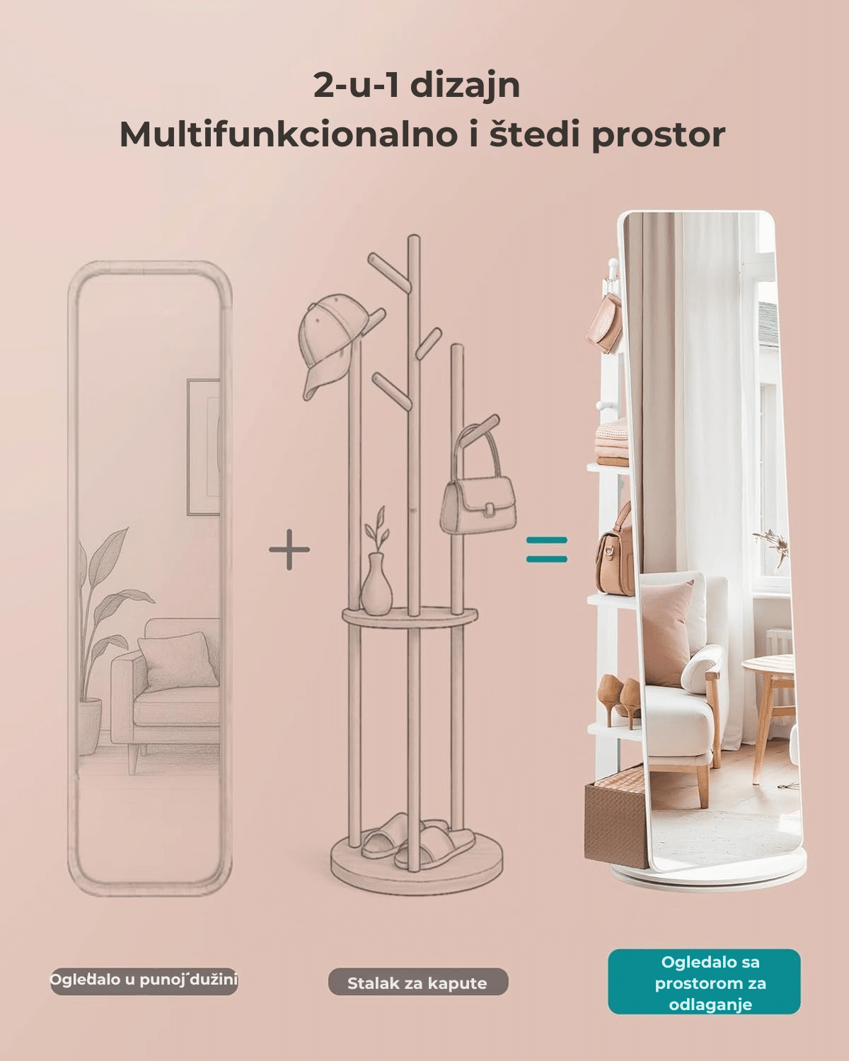 Ovo veliko ogledalo u punoj dužini omogućava da lako proverite svoj izgled i odaberete savršenu kombinaciju za svaki dan. Na zadnjoj strani nalaze se 4 police i 4 kukice, koje pružaju dodatni prostor za odlaganje aksesoara, torbi ili odeće. Zahvaljujući 360° rotaciji, sve što vam je potrebno uvek vam je nadohvat ruke.