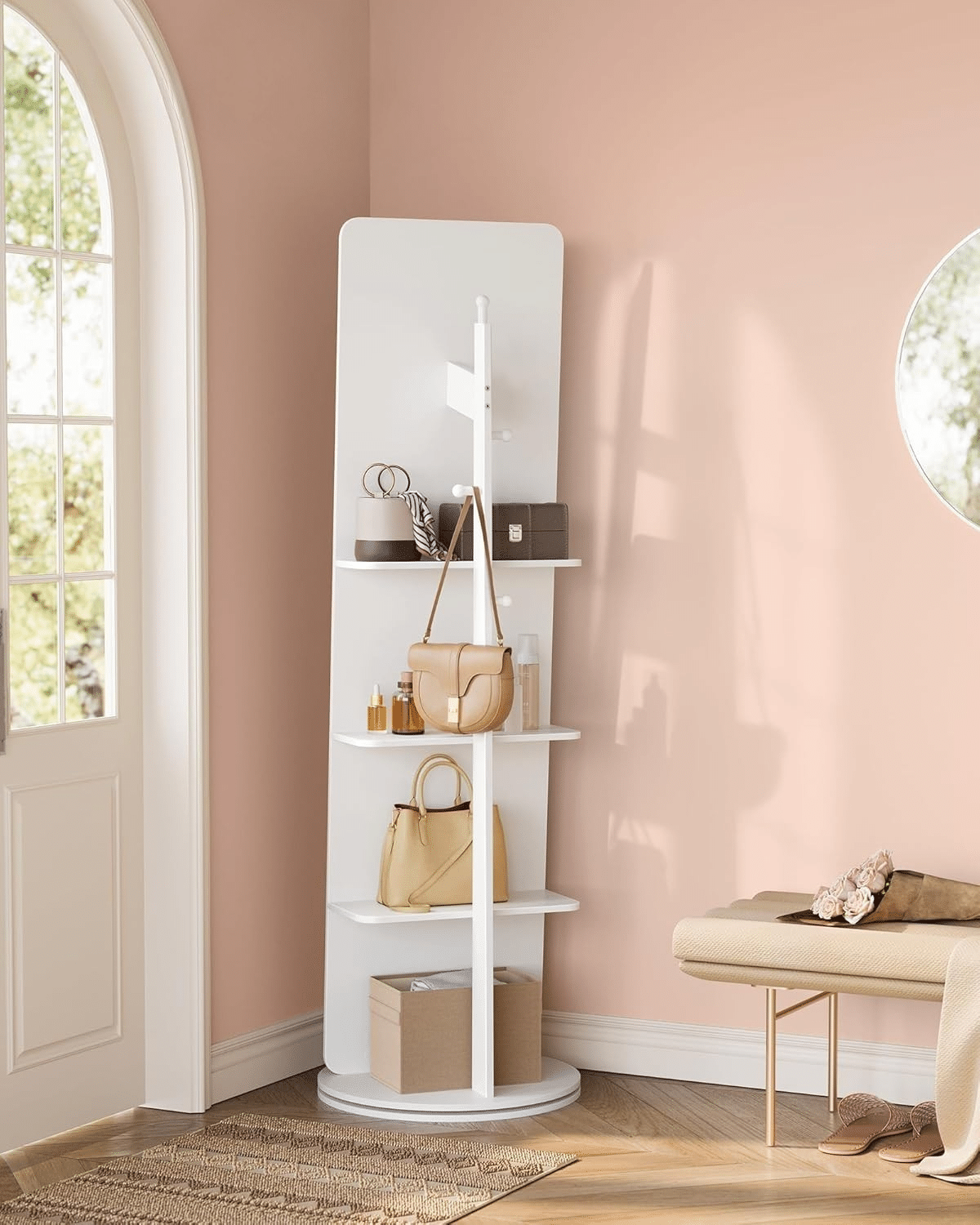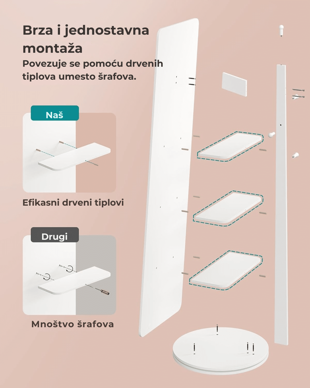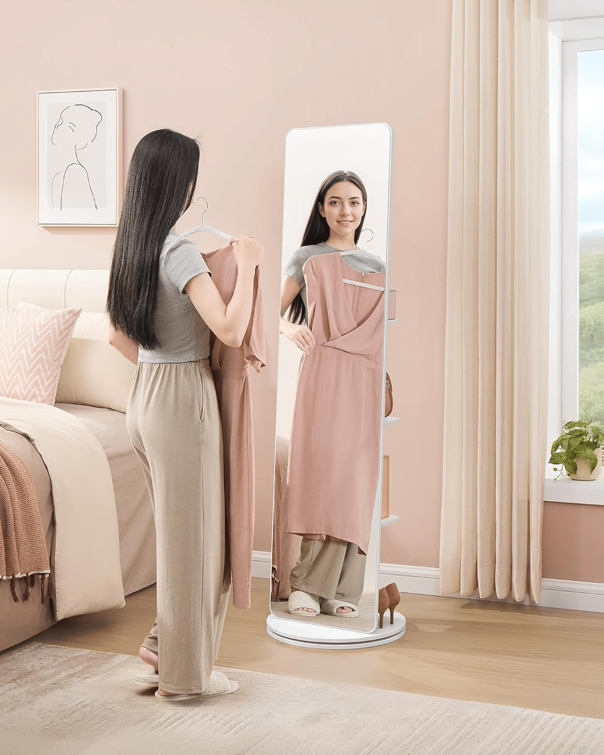 Ovo veliko ogledalo u punoj dužini omogućava da lako proverite svoj izgled i odaberete savršenu kombinaciju za svaki dan. Na zadnjoj strani nalaze se 4 police i 4 kukice, koje pružaju dodatni prostor za odlaganje aksesoara, torbi ili odeće. Zahvaljujući 360° rotaciji, sve što vam je potrebno uvek vam je nadohvat ruke.