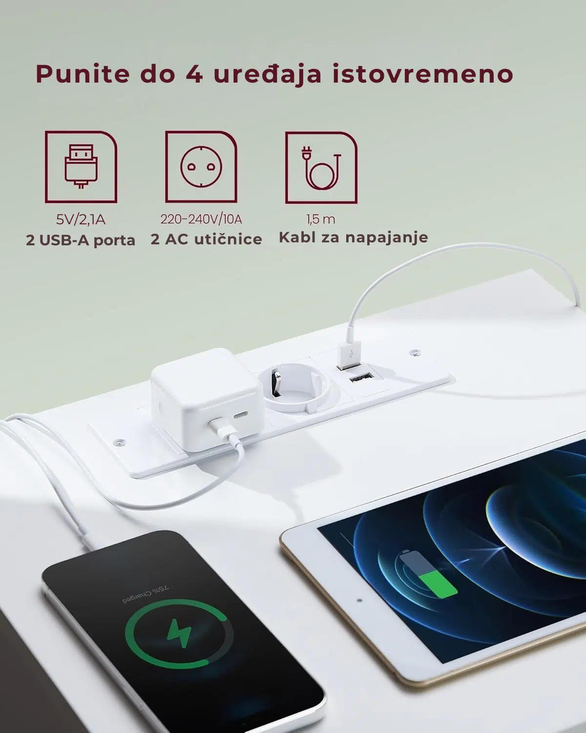 Zahvaljujući ugrađenom produžnom modulu sa 2 AC utičnice, 2 USB-A porta i kablom dužine 1,5 m, možete puniti sve uređaje – telefon, tablet, lampu ili laptop – direktno pored kreveta.