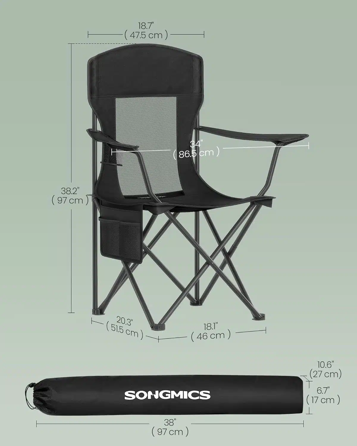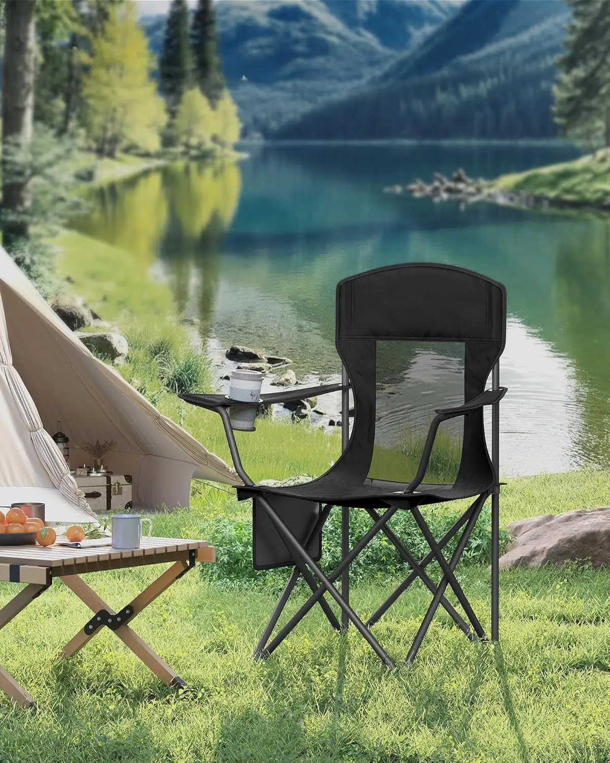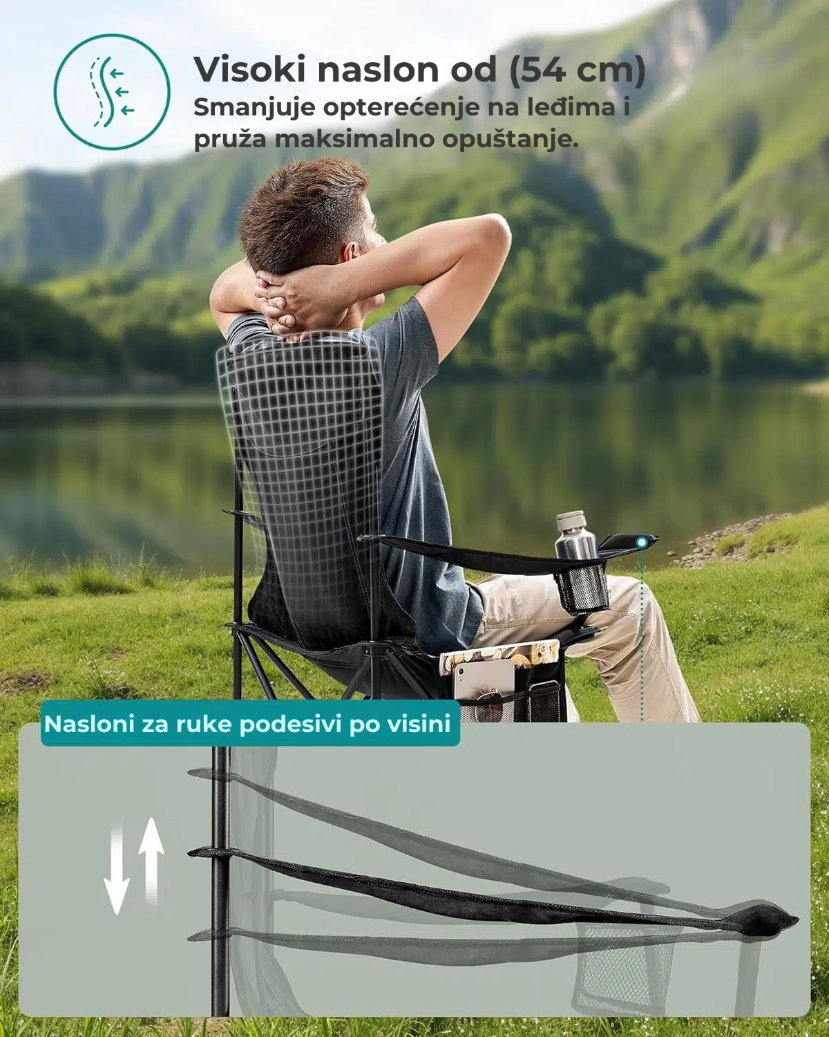 Sa visokim naslonom od 54 cm, širokim sedištem od 52 cm i podesivim naslonima za ruke, ova sklopiva stolica za kampovanje pruža maksimalnu udobnost tokom dužeg sedenja.