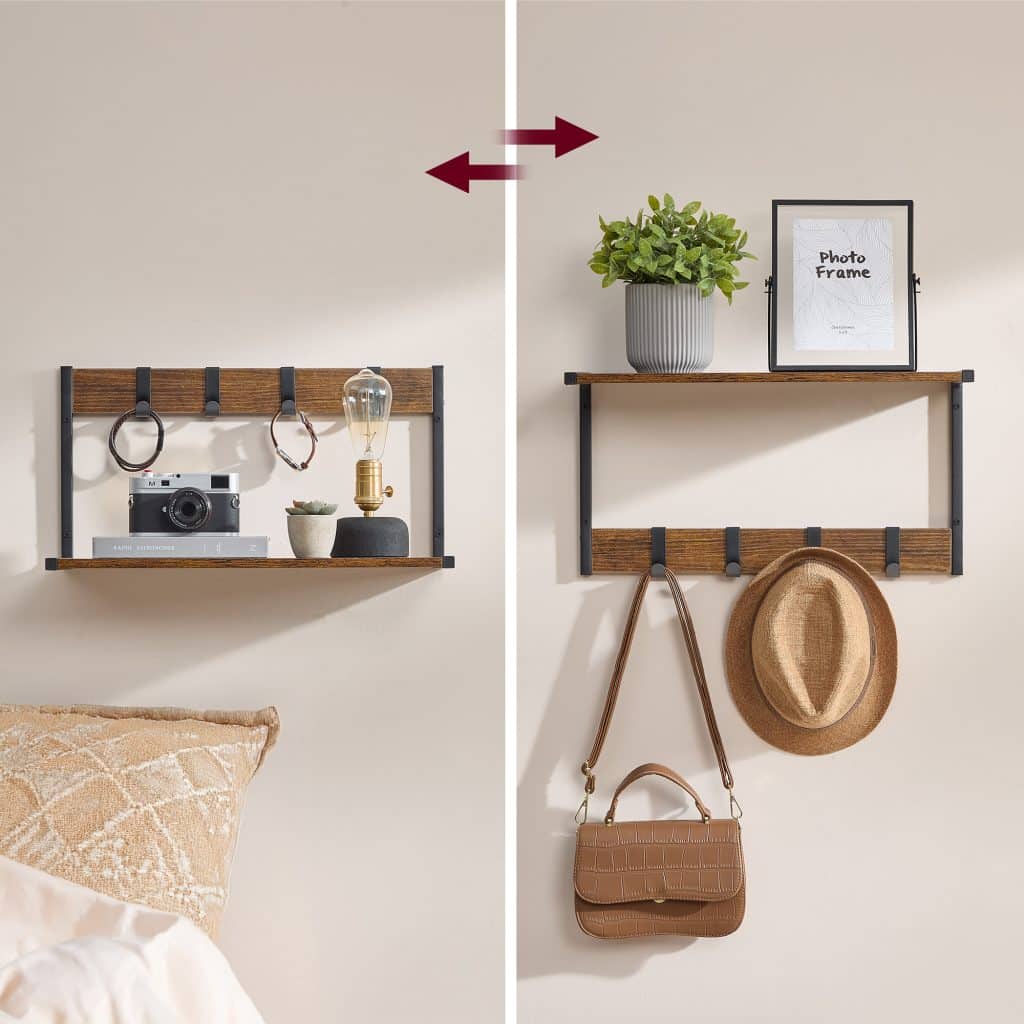 Ova zidna polica dolazi u setu od 2 komada, dimenzija 50 × 24,2 × 26,5 cm, i pruža veoma prostran otvoreni deo za odlaganje. Uz 4 uklonjive kukice omogućava praktično vešanje sitnica poput kuhinjskih alatki, ključeva, ukrasa ili dodataka, što doprinosi boljoj organizaciji prostora i većoj preglednosti.