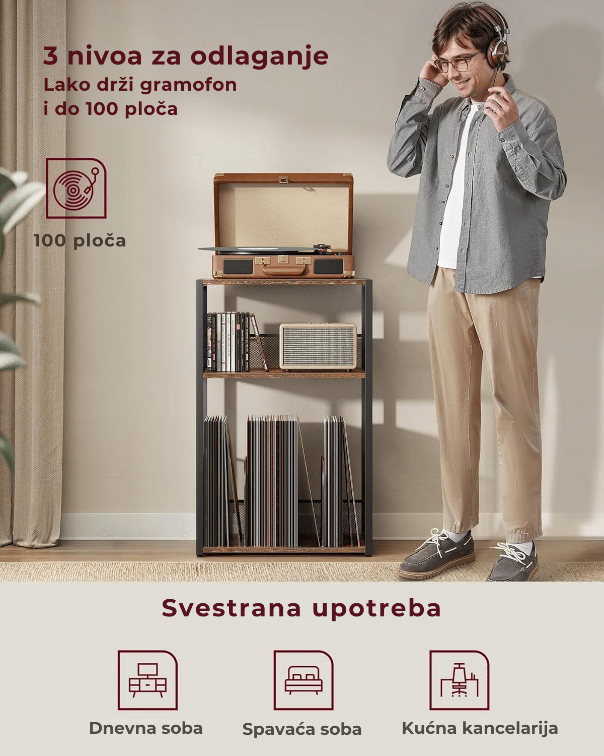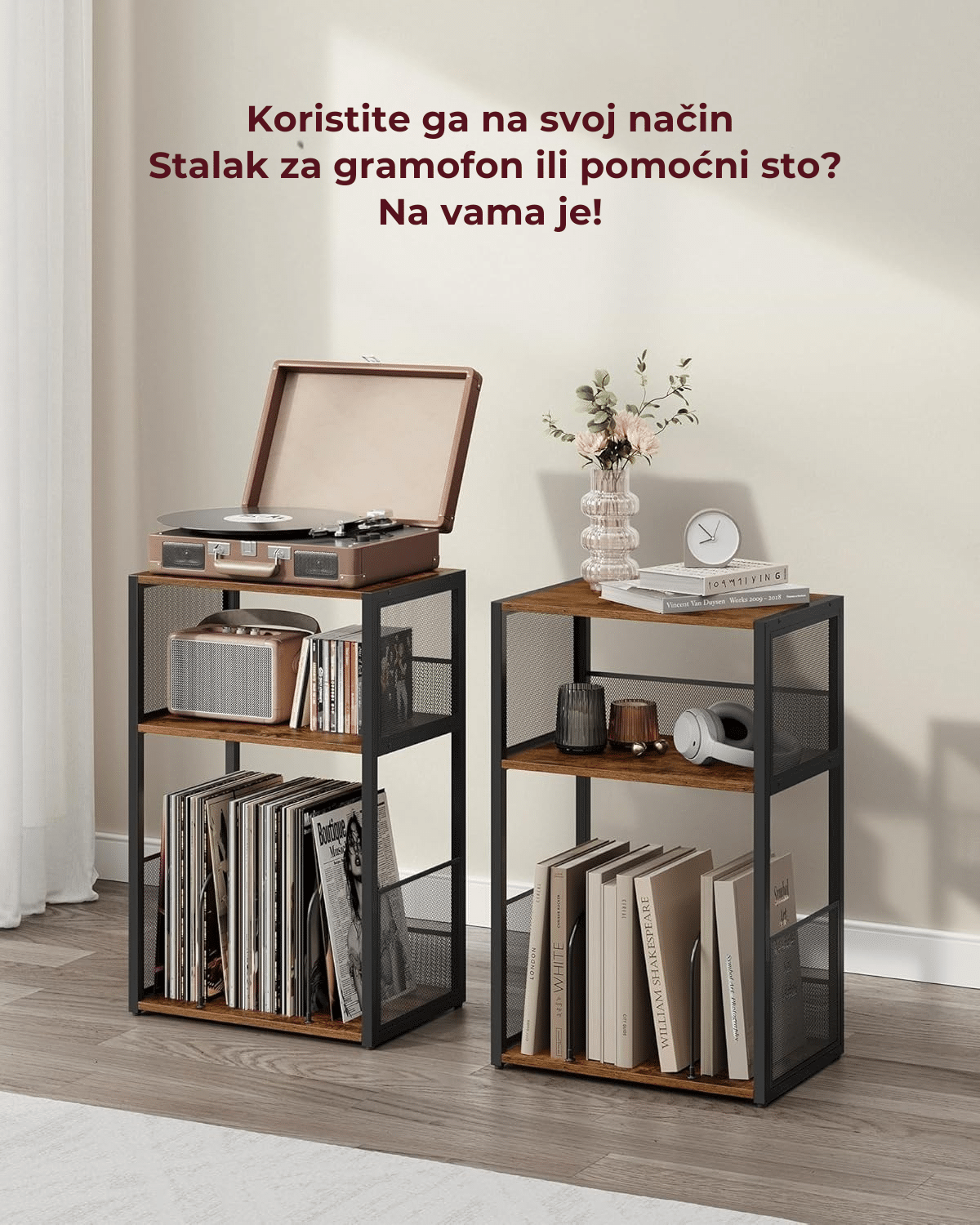Može se koristiti kao stalak za gramofon ili kao pomoćni sto u dnevnoj sobi, spavaćoj sobi ili radnom prostoru – savršen za kafu, knjige ili svakodnevne stvari.