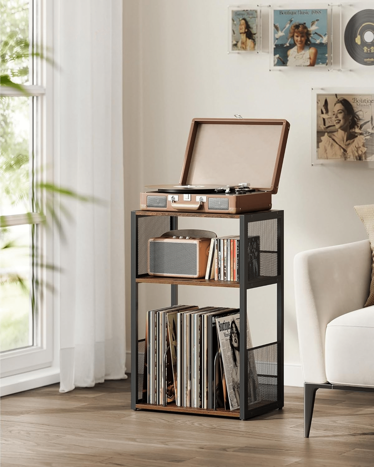 Gornja površina je idealna za gramofon, dok 2 otvorene police omogućavaju skladištenje do 100 ploča. Organizujte svoju kolekciju lako i pregledno.