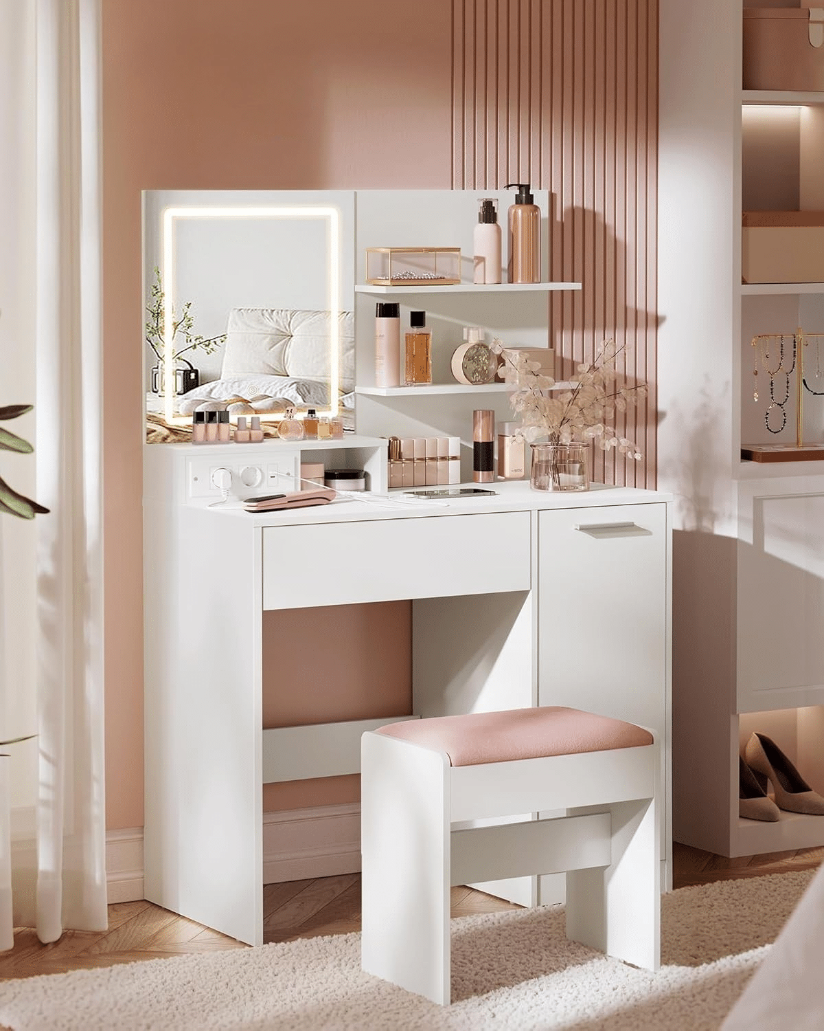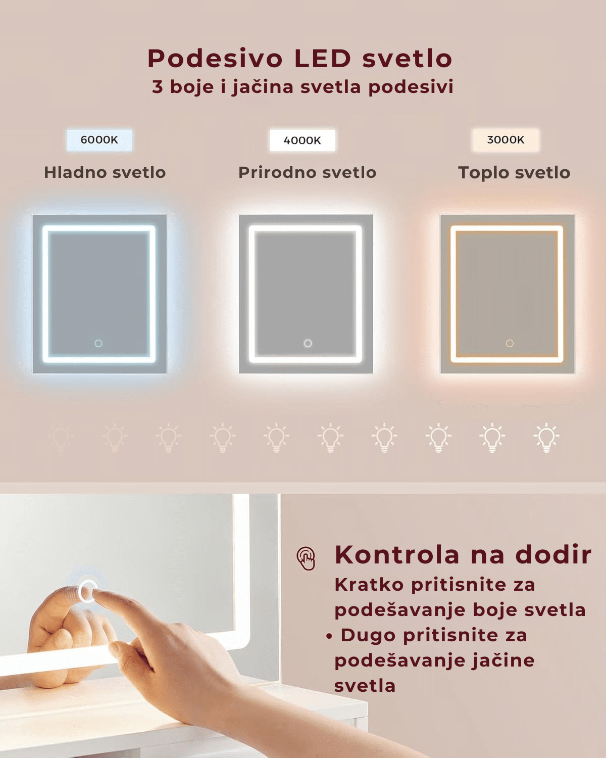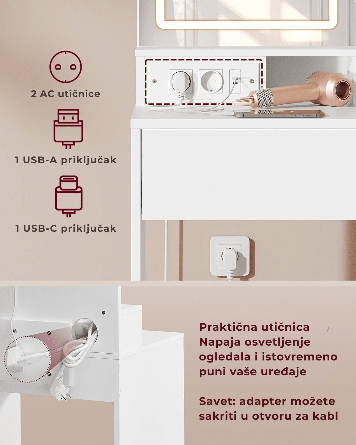 Ogledalo sa LED osvetljenjem poseduje 3 boje svetla koje se mogu uključiti i podešavati putem touch kontrole. Ugrađena utičnica sa 2 AC izlaza, 1 USB-A i 1 USB-C portom omogućava jednostavno napajanje uređaja i korišćenje beauty aparata.