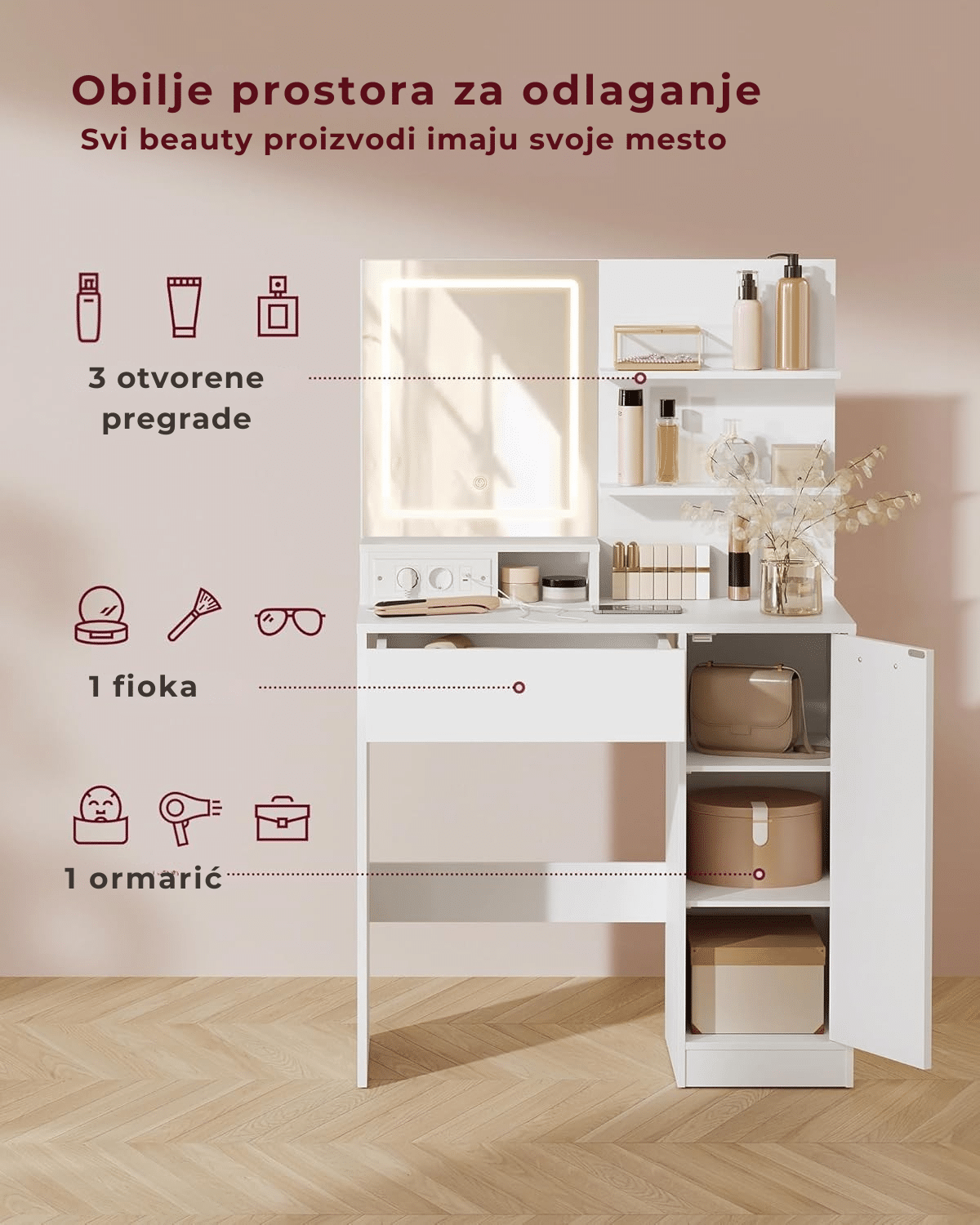 Ovaj sto za šminkanje nudi obilje prostora za odlaganje – parfemi i kreme mogu se smestiti na dve police, alat za kosu u fioku, dok ostali proizvodi lako nalaze mesto u donjem ormariću. Sve vaše beauty potrepštine biće uredno organizovane i uvek pri ruci.