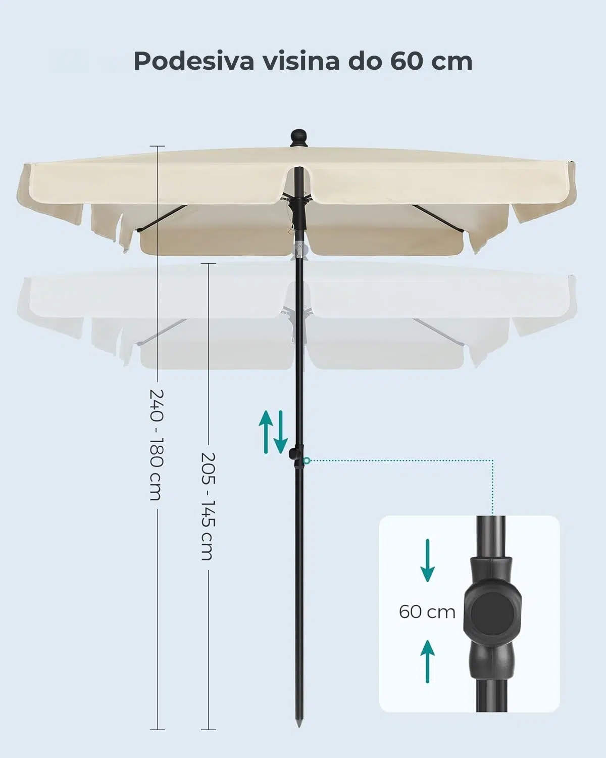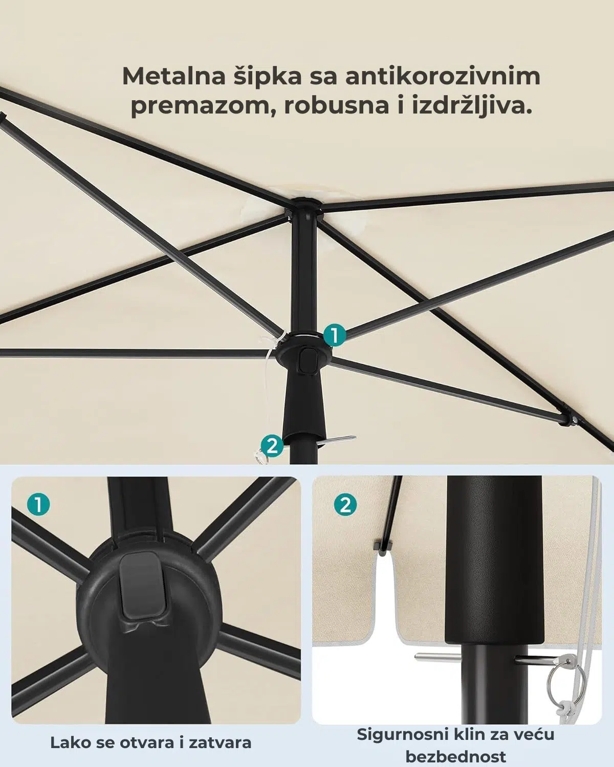Ne dozvolite da vam nestabilan suncobran pokvari odmor. Metalni sigurnosni graničnik ispod mehanizma zaključava konstrukciju i sprečava da se suncobran iznenada zatvori, tako da možete bezbrižno uživati u hladovini.