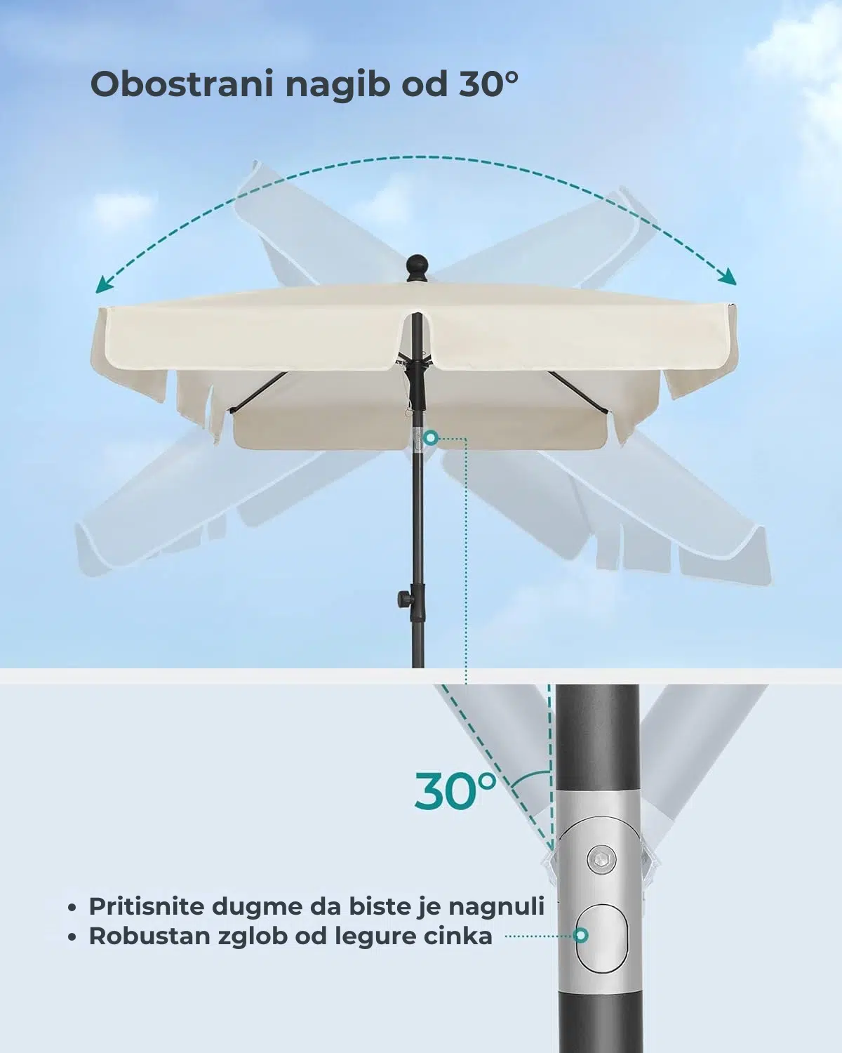 Bez obzira da li želite da provedete vreme na balkonu ujutru ili popodne, ovaj balkonski suncobran možete lako prilagoditi. Jednostavno ga otvorite, nagnite platno i podesite željenu visinu. Zglob od legure cinka izdržava svakodnevna podešavanja i garantuje dugotrajnost.