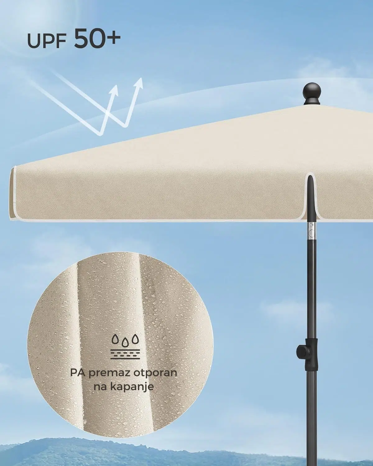 Ne možete da uživate na balkonu zbog jakog sunca? Ulepšajte svoj prostor ovim pravougaonim suncobranom za balkon koji pruža odličnu UPF 50+ zaštitu od UV zračenja zahvaljujući platnu sa PA premazom. Idealan je za zaštitu od sunca tokom toplih letnjih dana.